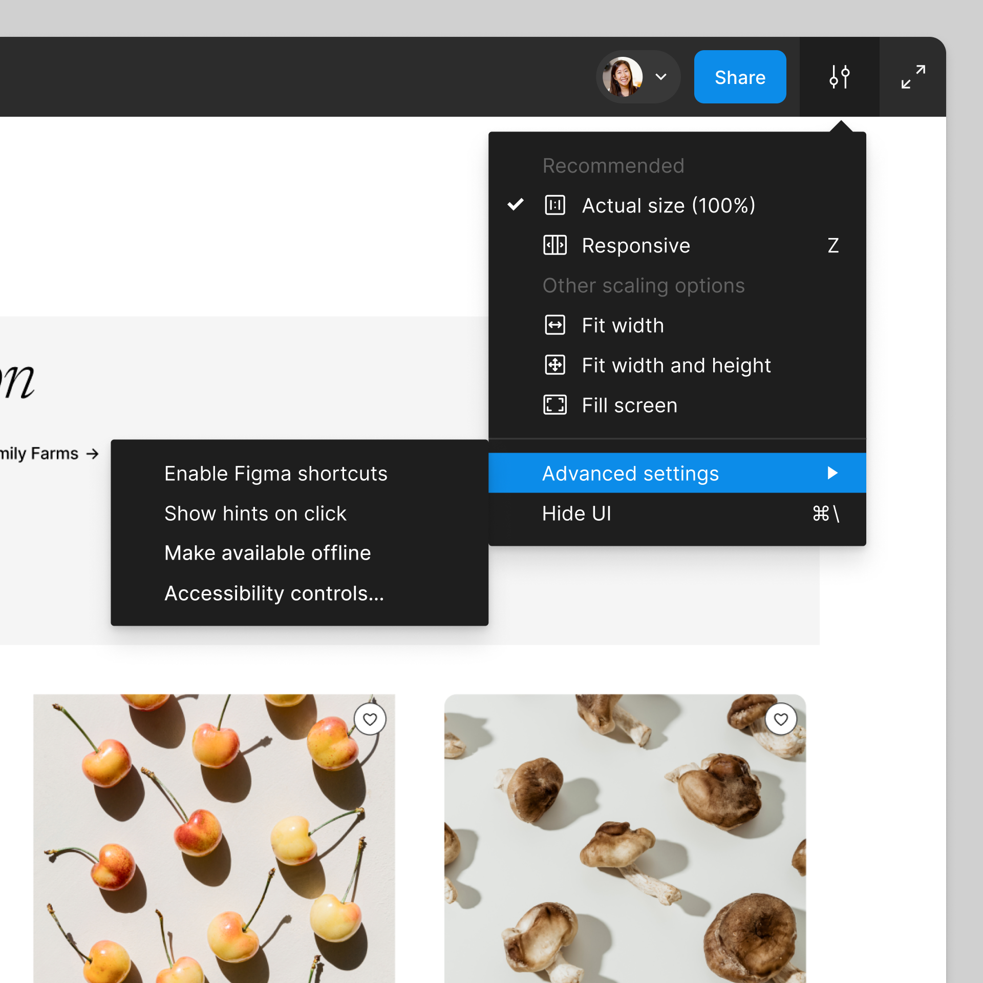 - Öffne das Überlaufmenü, um aus verschiedenen Skalierungsoptionen für den Prototyp auszuwählen.