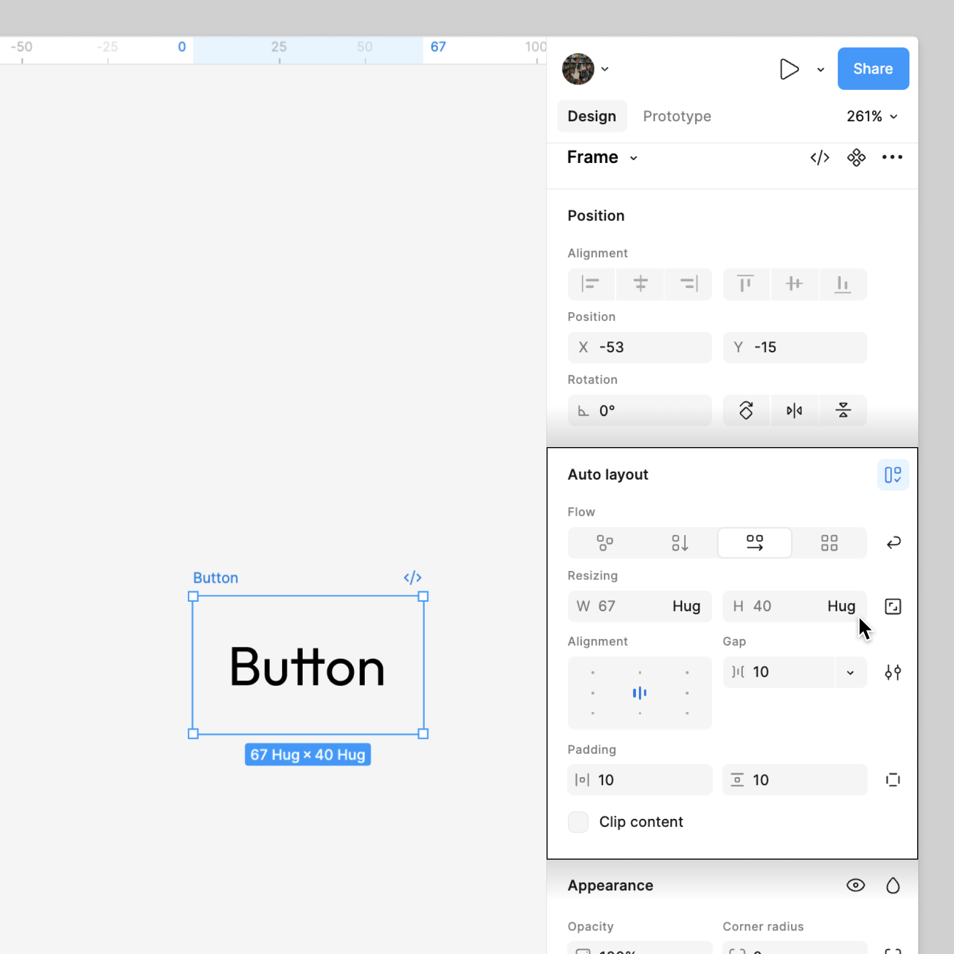 - In the Auto layout section of the right sidebar, make sure the Horizontal resizing and Vertical resizing settings are both set to Hug contents. Setting the resizing to Hug contents ensures that the button frame will automatically grow or shrink when the label changes.