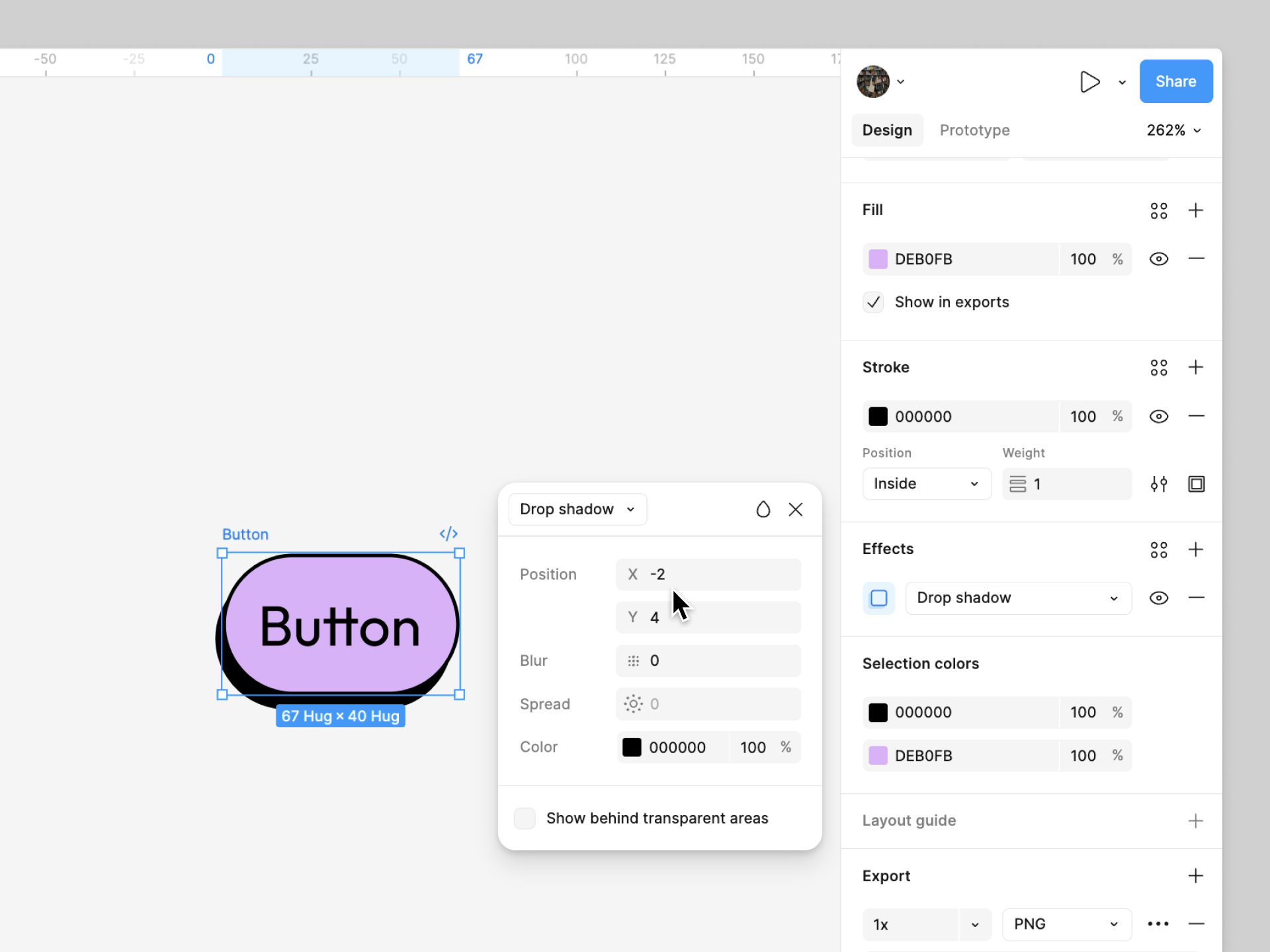 Buttonframe. - Click the plus in the Effects section of the right sidebar and choose Drop shadow from the dropdown menu.