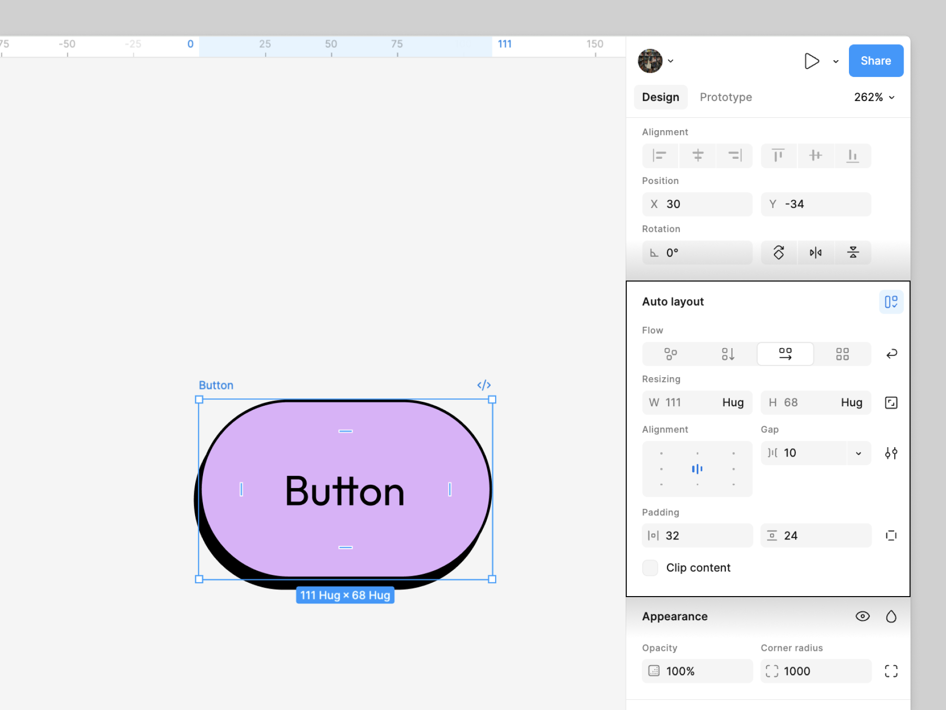 You may be wondering why we set the button’s corner radius to 1000 px when a lower value would produce the same effect. Using a higher corner radius value helps future-proof components and ensures that the corners stay fully rounded, even if the height of the frame changes later.