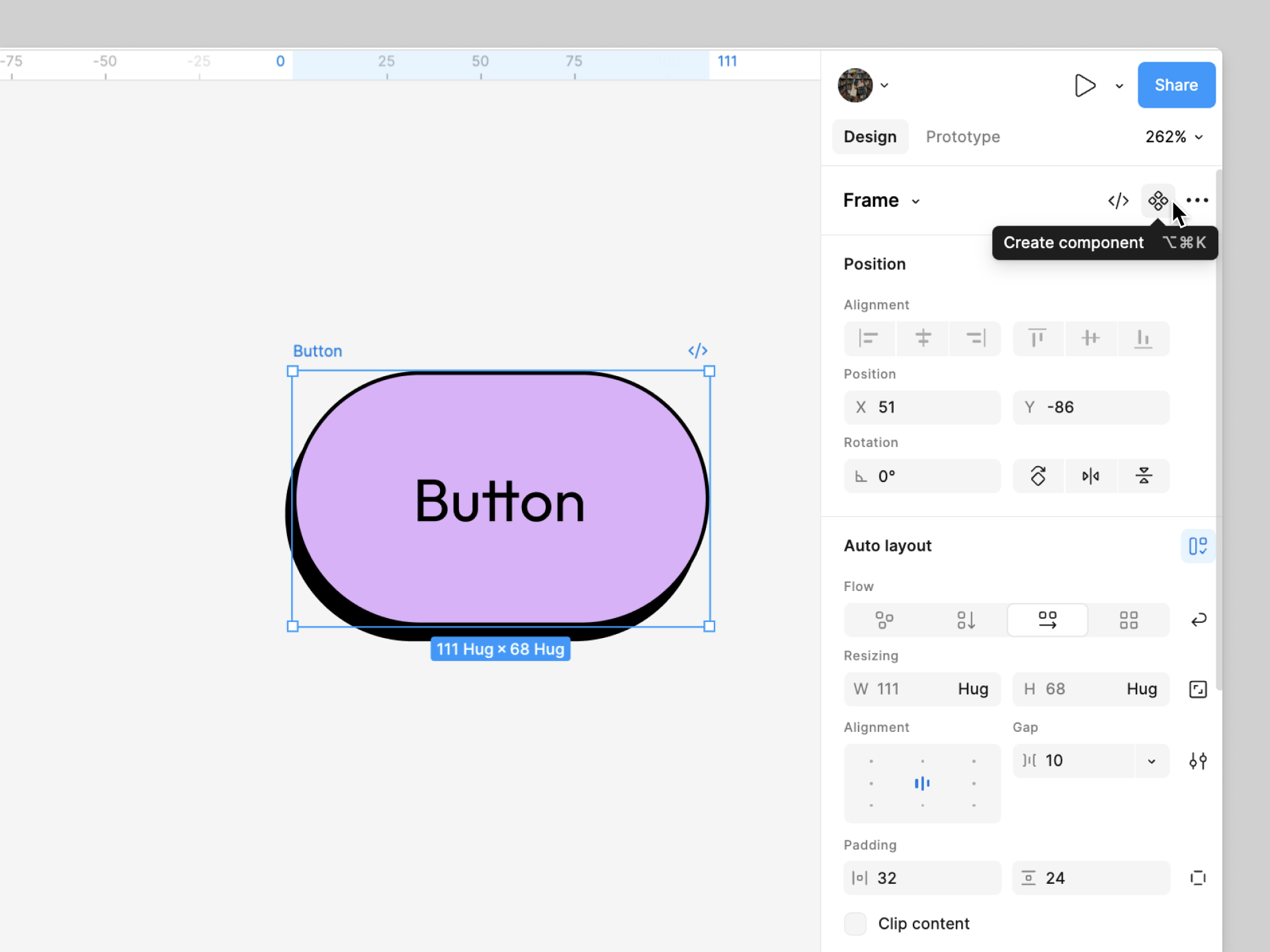 Buttonframe. - Click Create component in the right sidebar or use the shortcut: