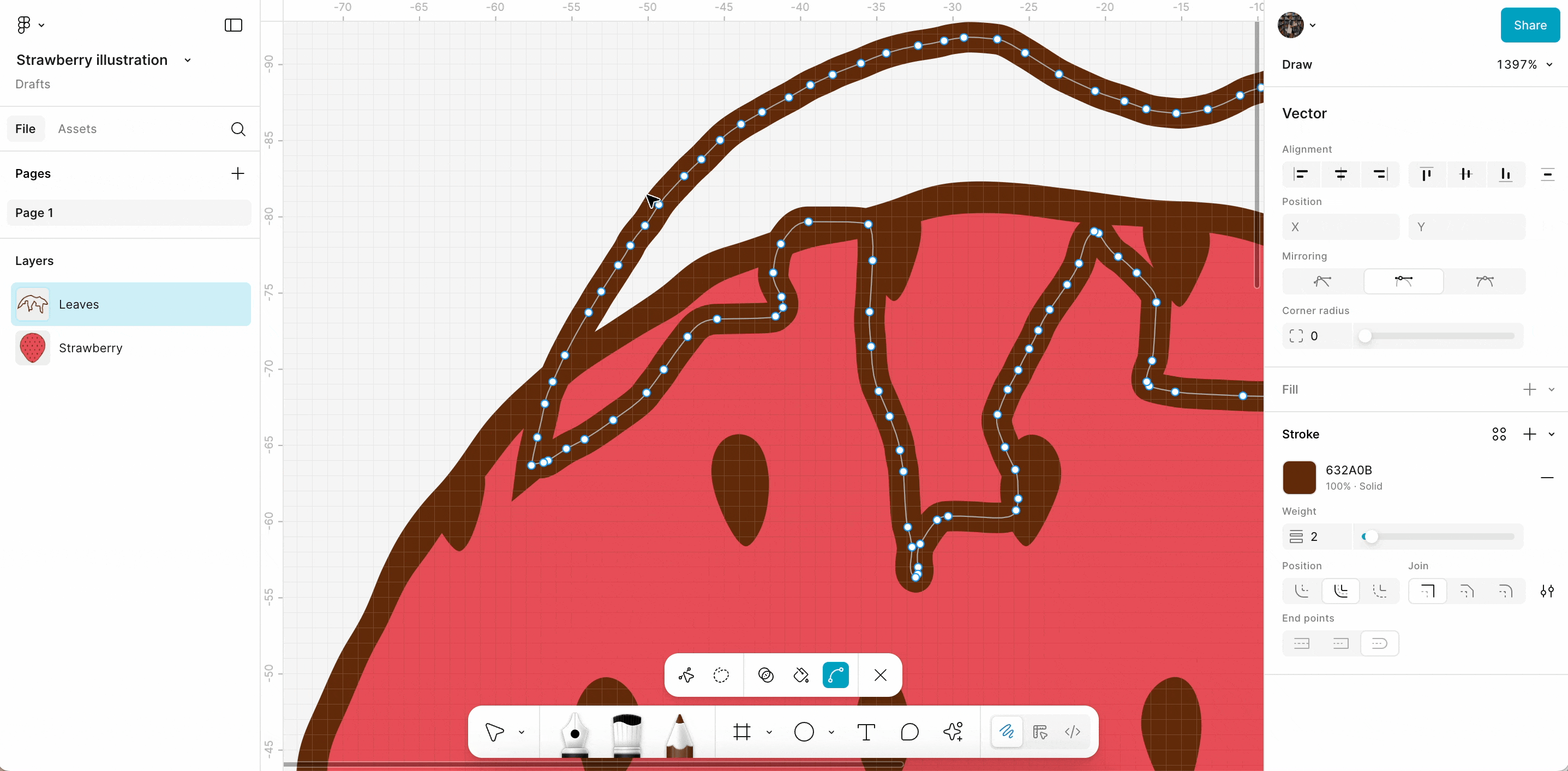 2and change the fill to the same reddish-brown:#632A0B. - Click and drag your cursor to sketch out the leaves. Use the Strawberry layer as a guide to help you with size and placement of the leaves. Rough sketches are fine! We’ll learn how to smooth them out shortly.