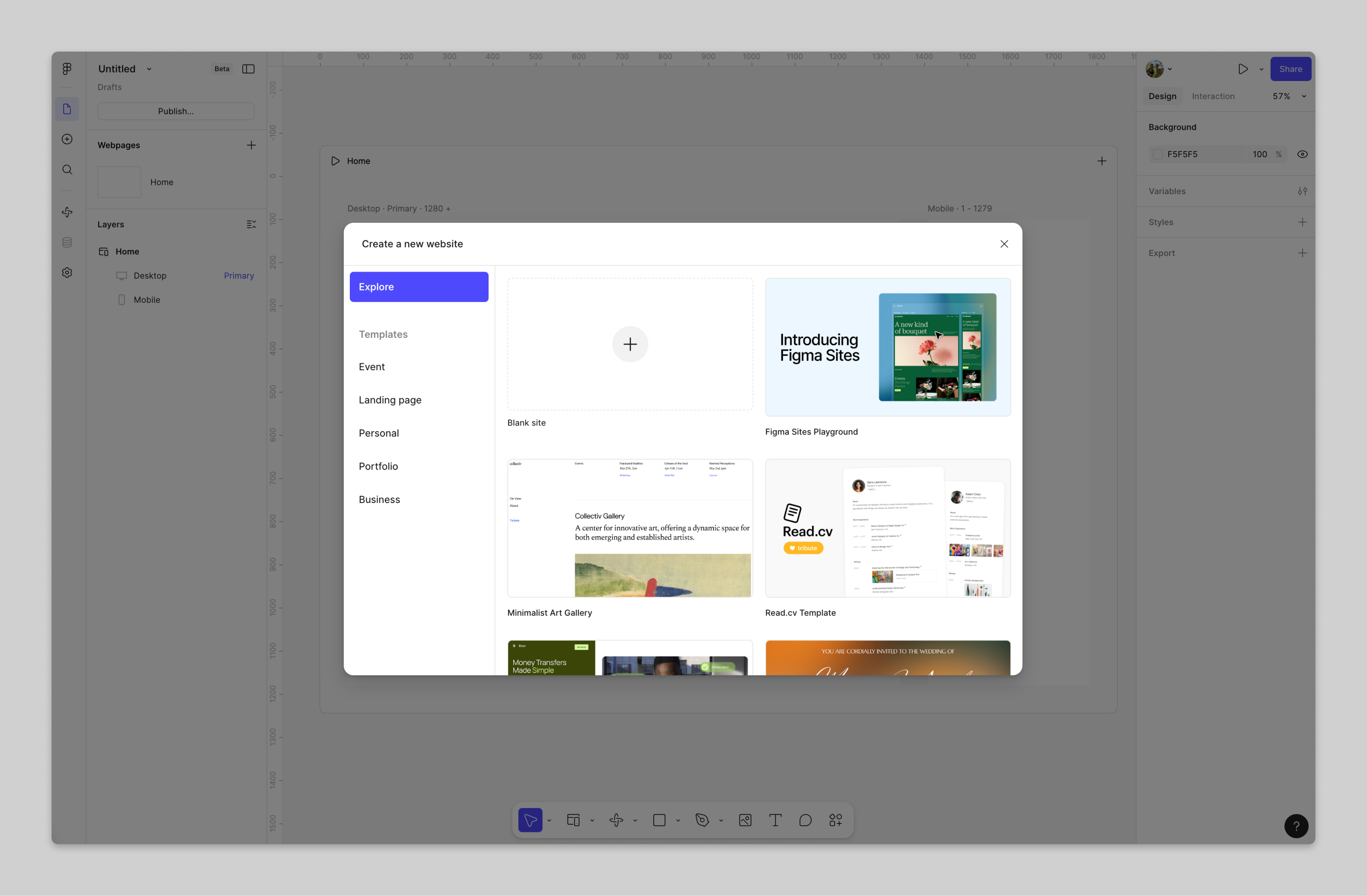 Figma Sites has several ways you can start building, no matter your skill level. You can start with a template, a blank site, or from a design you created in Figma Design. Feel free to explore all of these options, depending on whichever one suits your needs and goals.