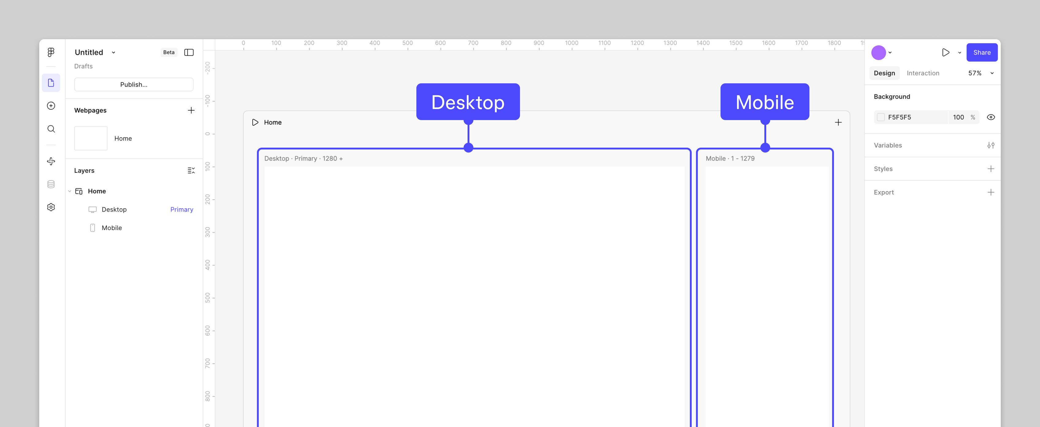 Every new website in Figma Sites starts with a single webpage with two breakpoints: Desktop and mobile. These are where you’ll add content for the webpage. Breakpoints are a core part of working in Figma Sites.