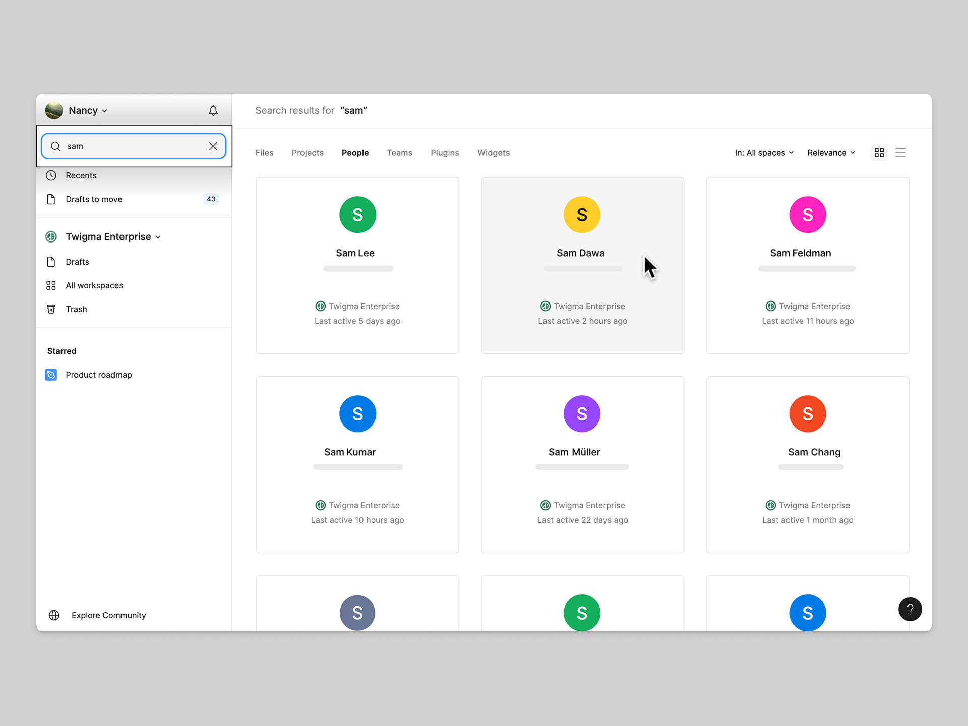 - As you type a user's name, Figma looks for matches and displays your search results.