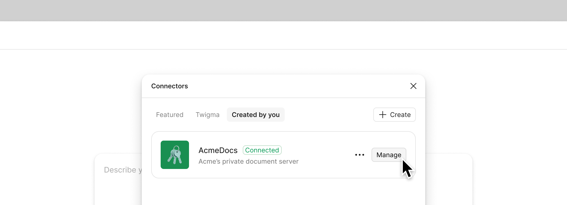 - Custom connectors let users connect to any MCP server, including internal tools and private data sources. These connectors aren’t vetted by Figma. By default, only organization admins can create custom connectors, but you can change this setting to allow members to create them as well. Learn more about security best practices for creating custom connectors.
