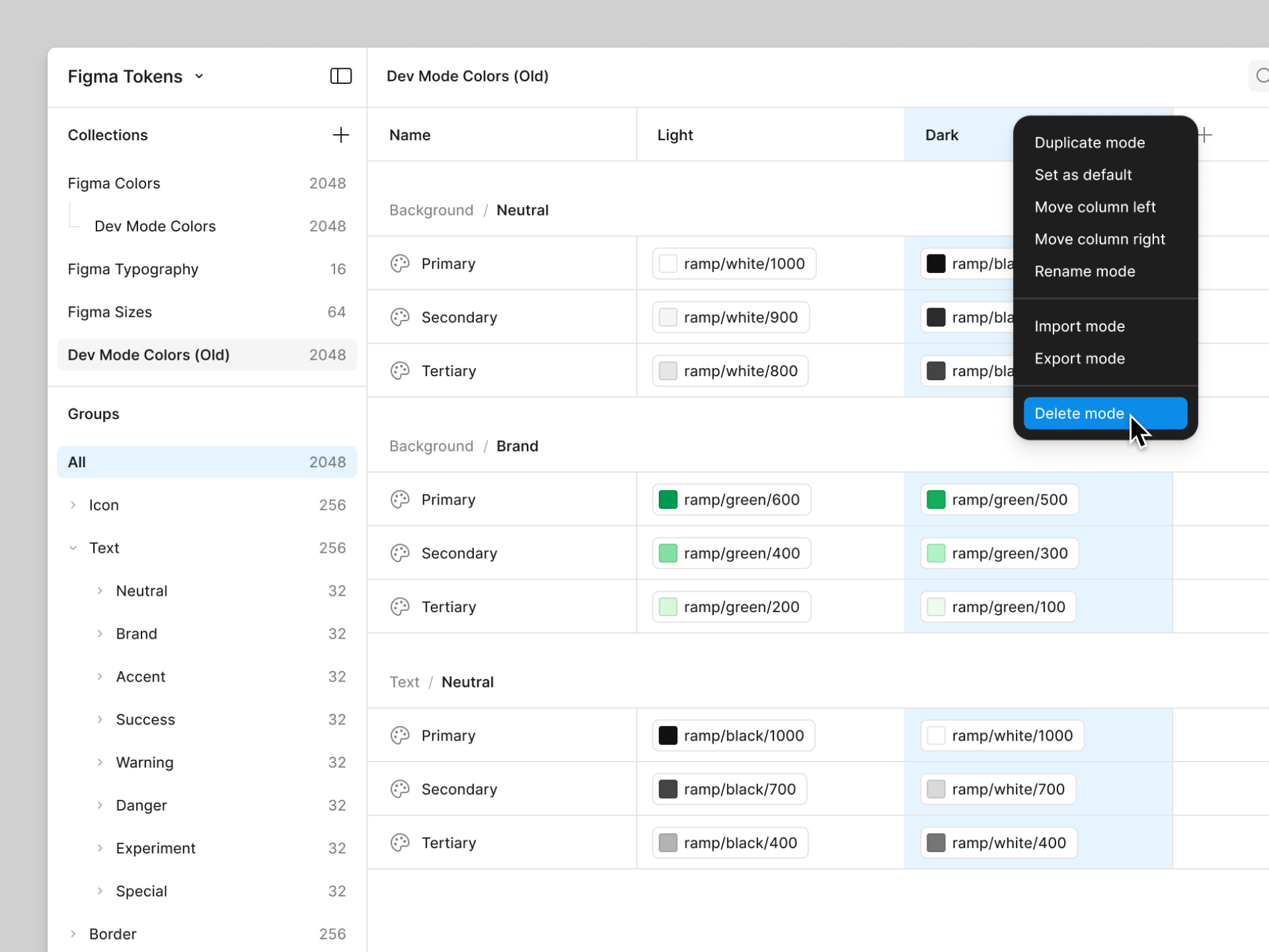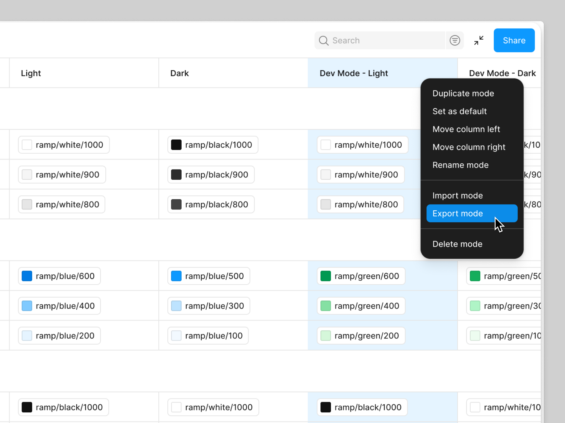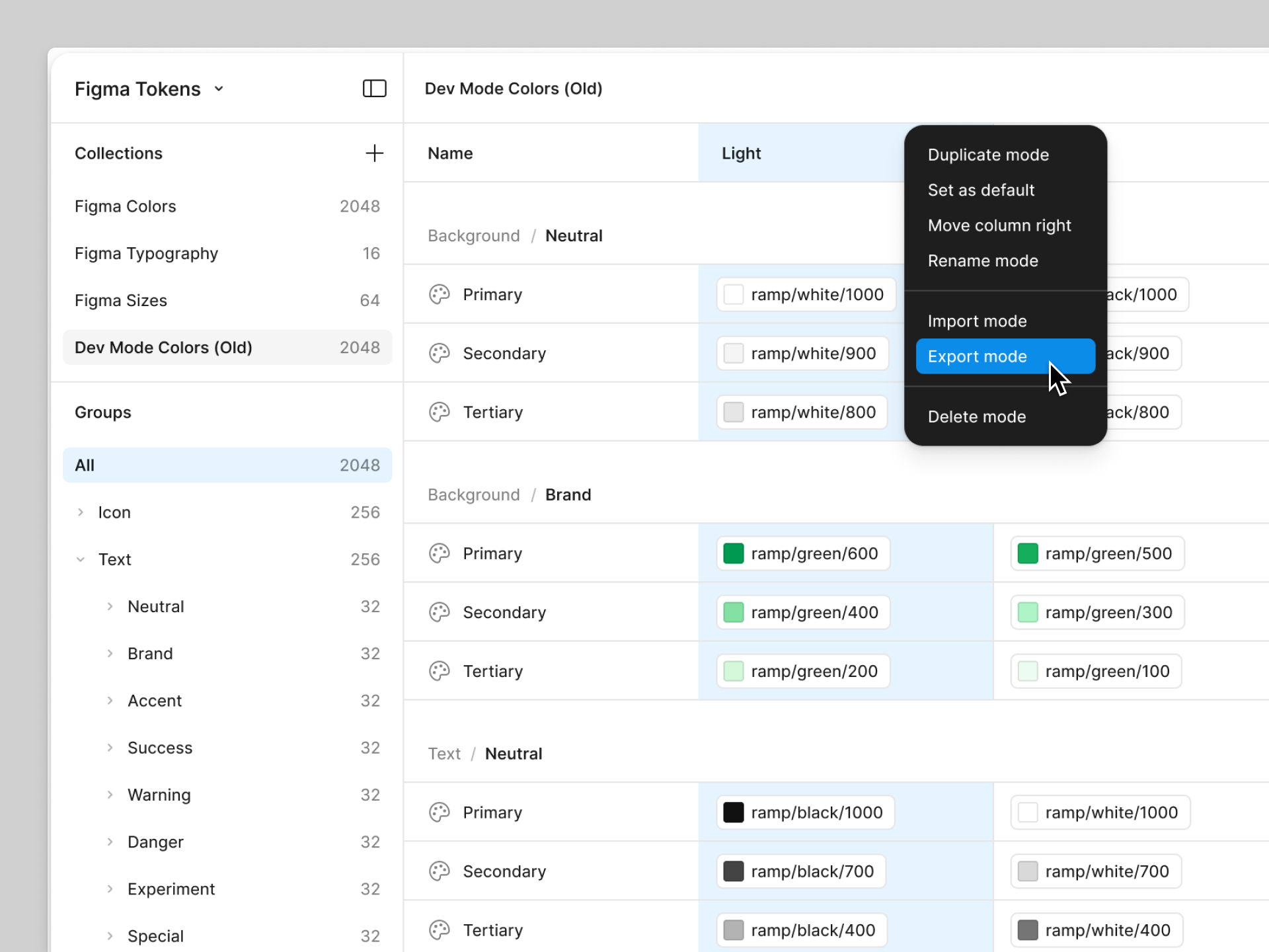 - Select a brand mode from your list of modes, then right-click on it and choose Export mode. The variables will be exported to a JSON file.