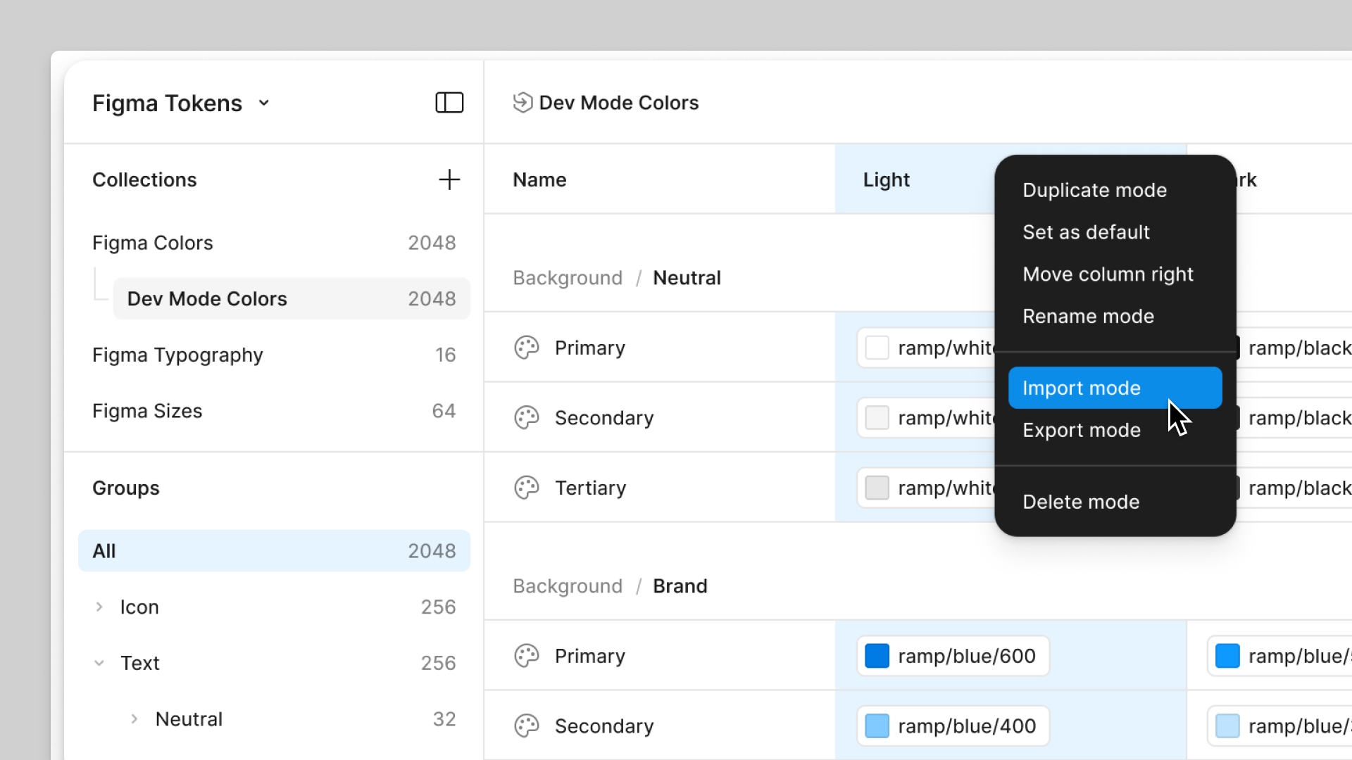- Select a mode column, then right-click on it and choose Import mode. Select the corresponding JSON file to import over the existing mode.