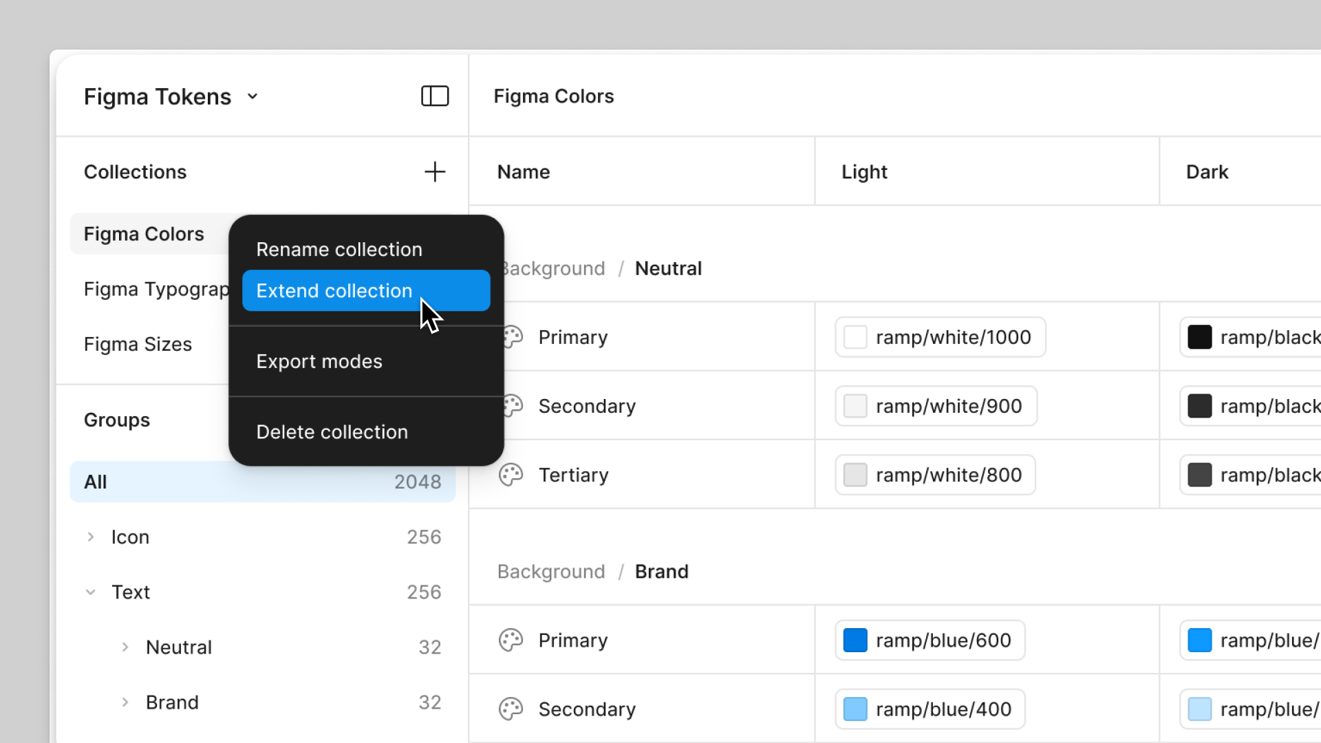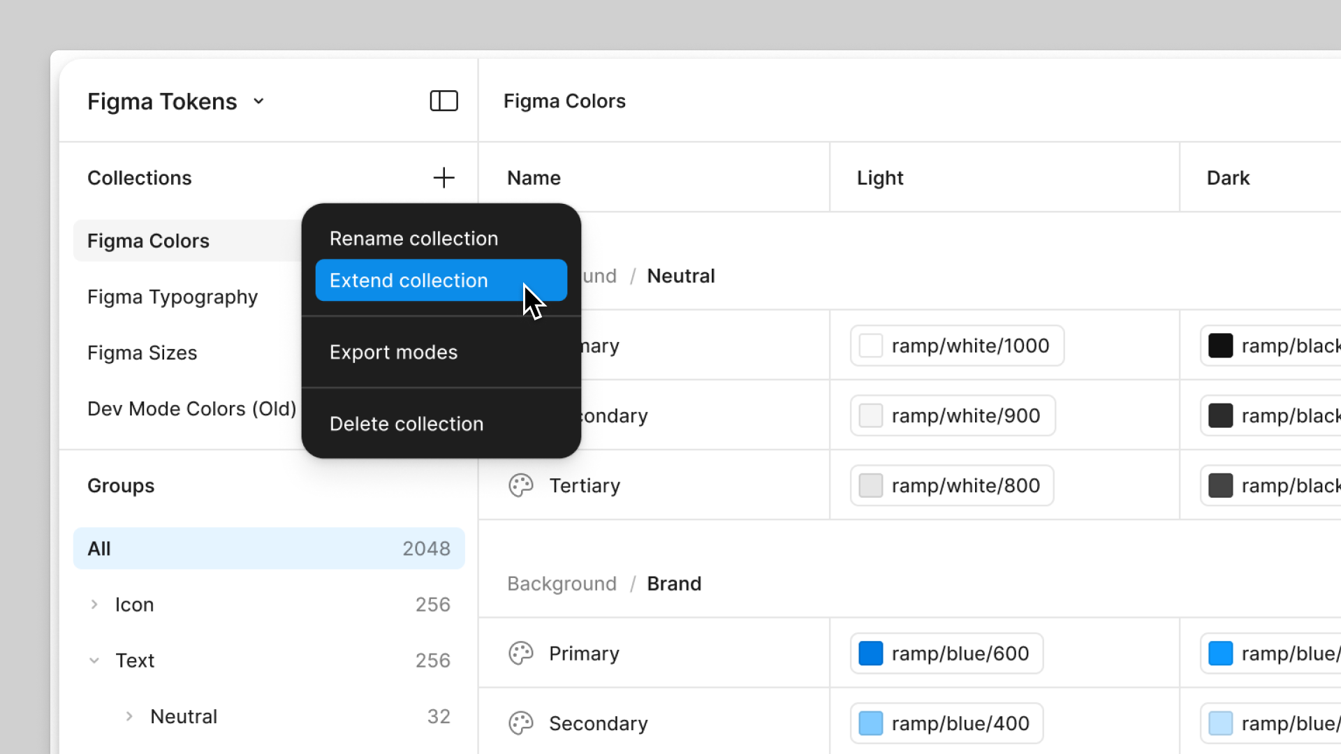 Extended collections help you manage multi-brand design systems. With extended collections, design systems authors can create a parent collection, then extend it to create an instance for each brand. Designers can then override variables within the extended collection to match their brand-specific themes.