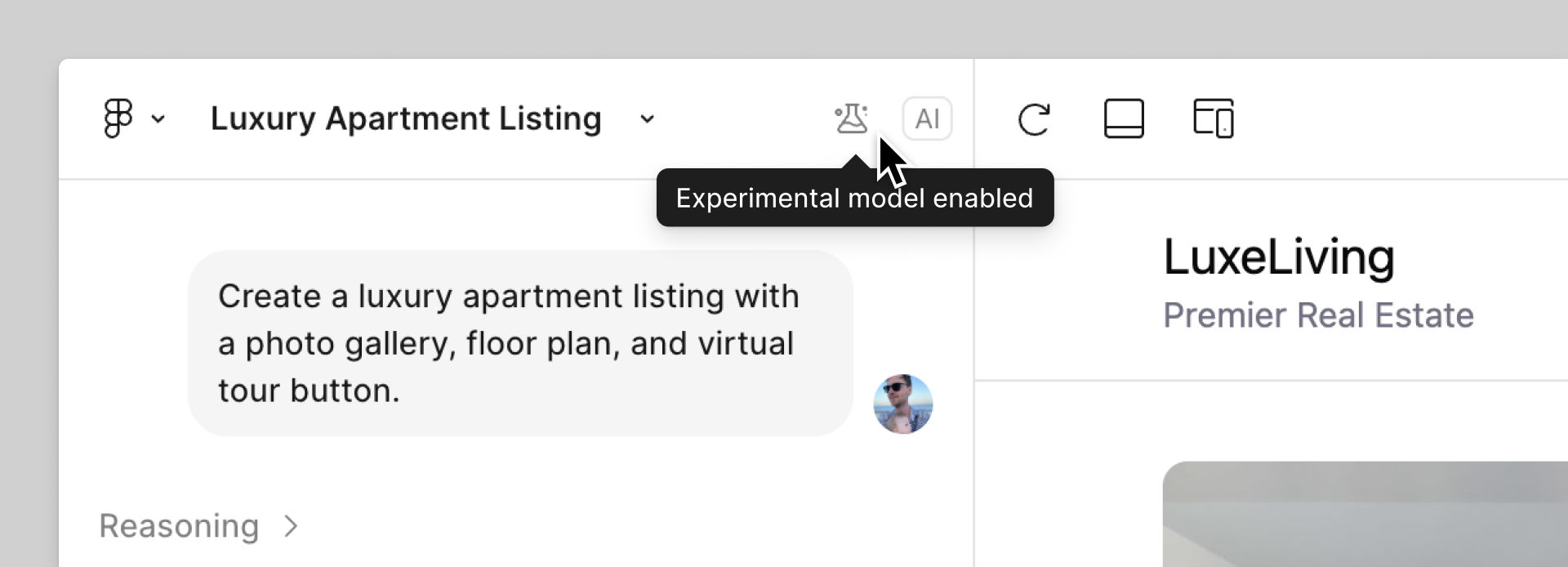 Tip: Figma displays a beaker icon above the chat when an experimental model is active.