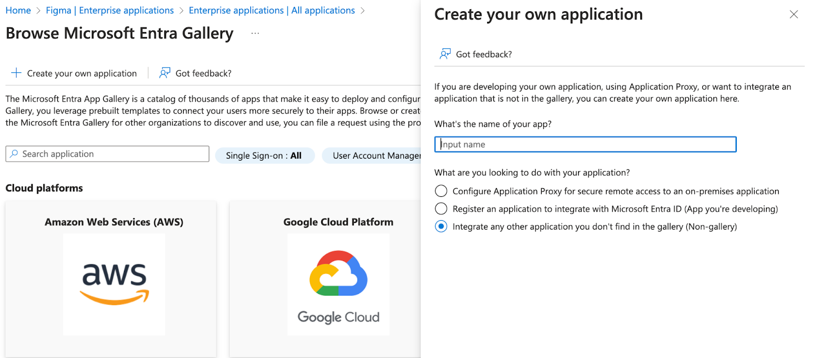 - Enter a name for your application, such as "Figma Custom App", select the Integrate any other application you don't find in the gallery (Non-gallery) option, and click Create.