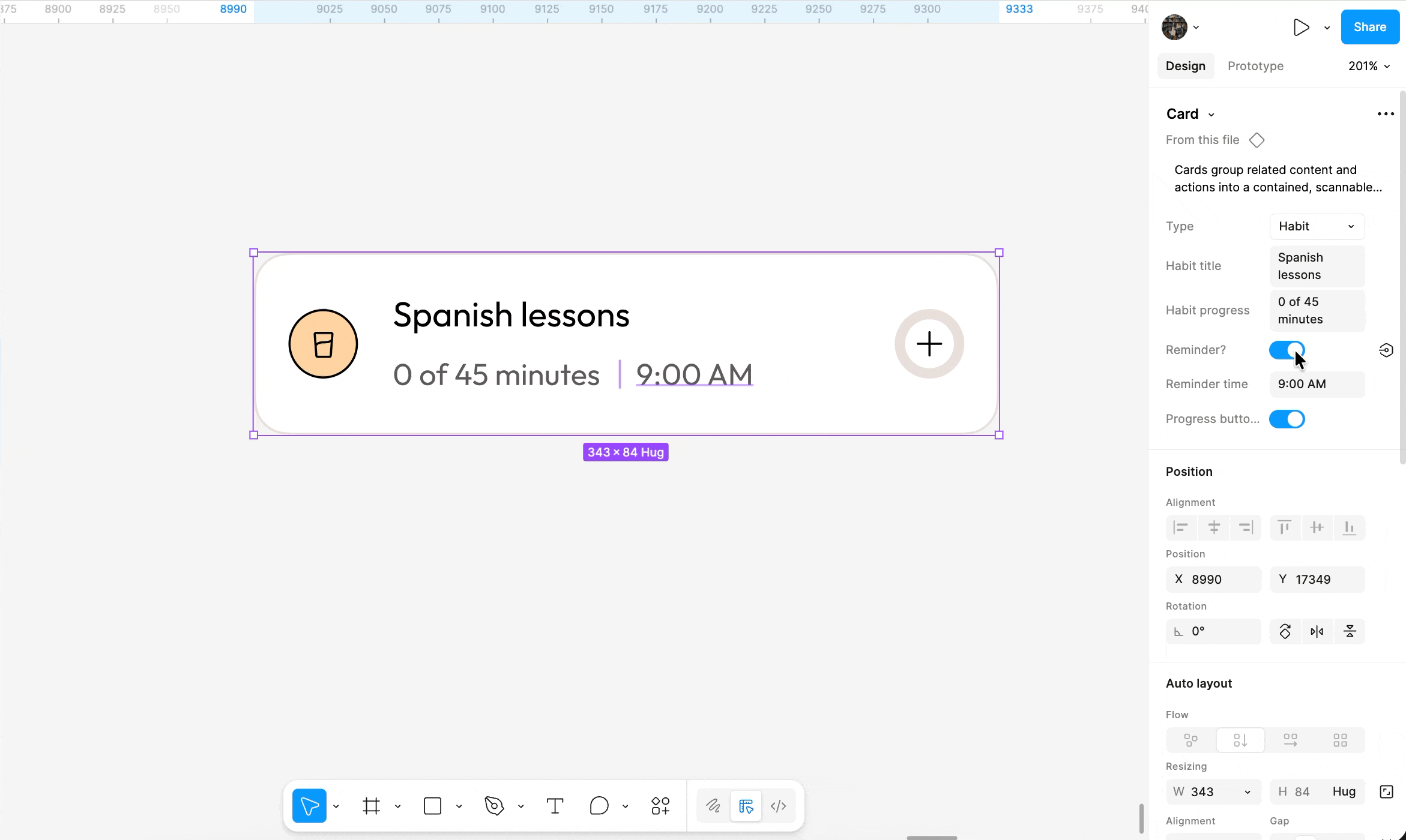 Boolean properties can make your components more modular. For example, imagine designing a card component that includes optional elements like an icon, status indicator, or button. Without boolean properties, you’d need separate components for every possible combination of optional elements, which could quickly become unmanageable as options multiply. Instead, you can use boolean properties to create a flexible component where users can toggle optional elements on or off as needed, directly from the right sidebar.