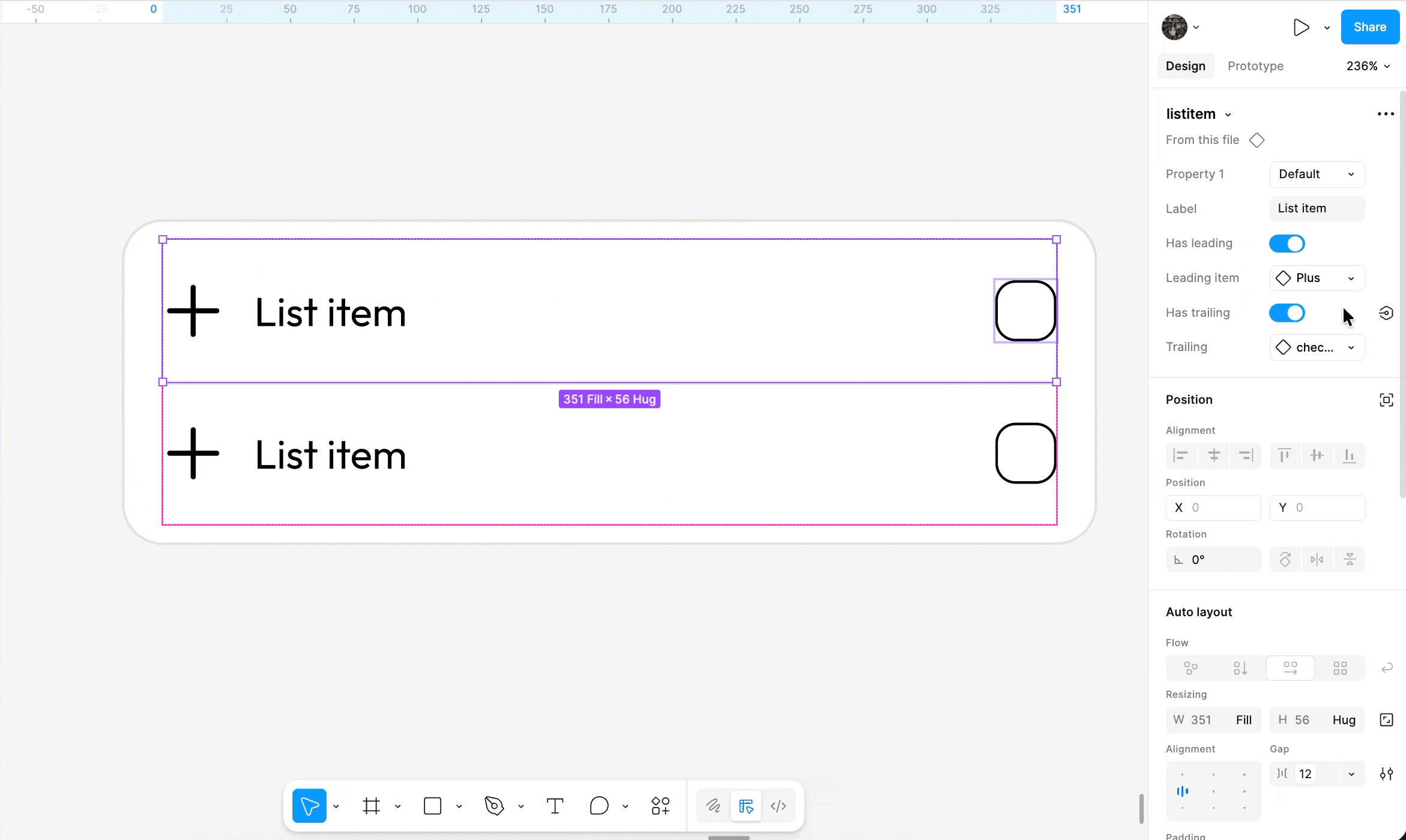 Instance swap properties let you indicate which nested instances can be replaced and curate a list of suitable alternatives. For example, when designing a list item that includes an icon, you can apply an instance swap property to the icon and specify preferred icon alternatives. Users can then change icons directly from the right sidebar without clicking into the instance on the canvas.