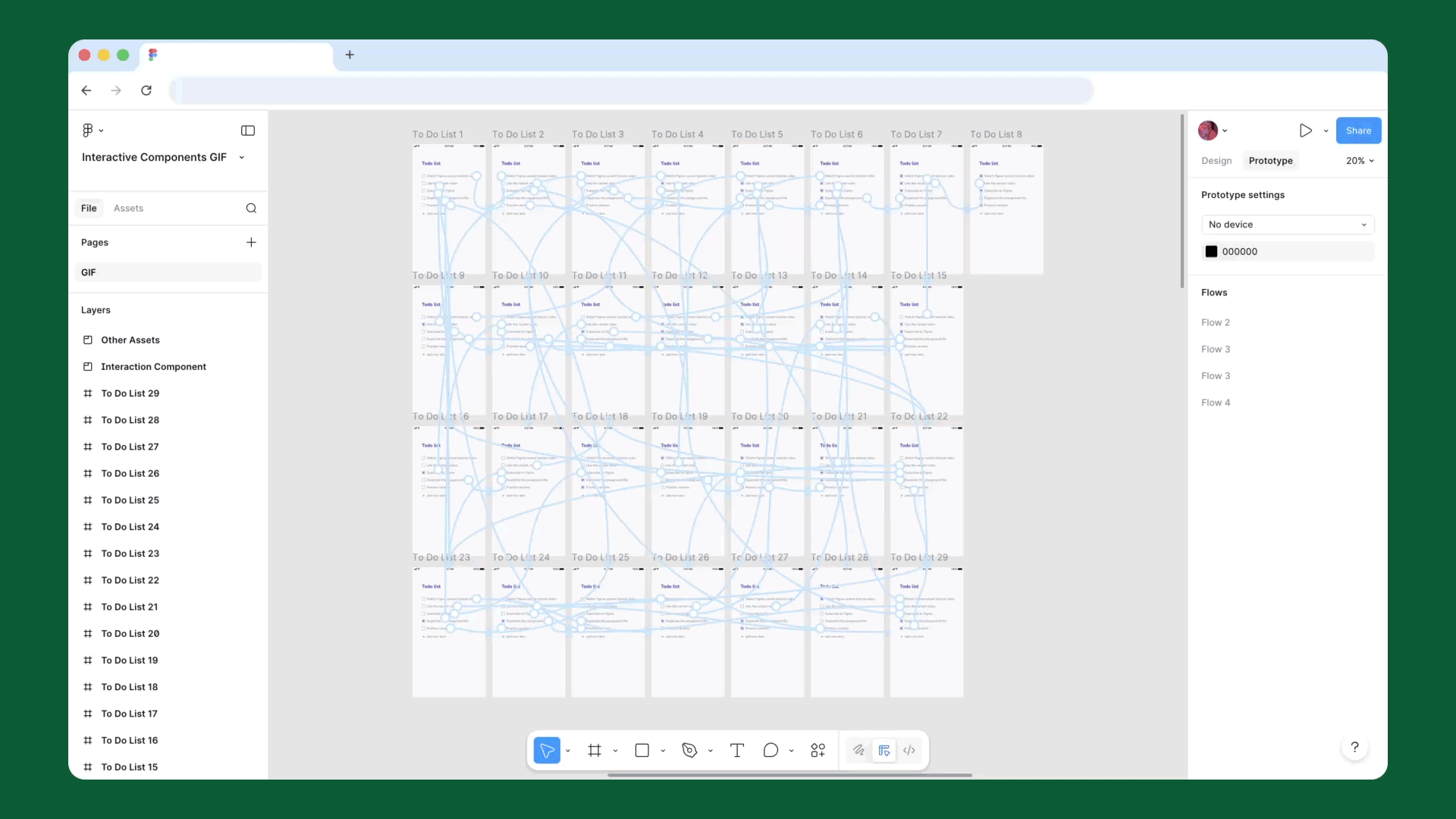 Without interactive components, prototyping even simple interactions requires creating numerous frames and manually adding prototype connections to account for every possible state combination. For example, think about an interactive checklist with five checkboxes. To create this, you would need to duplicate the original frame 32 times and create 160 prototype connections to cover every possible combination of checked and unchecked states!