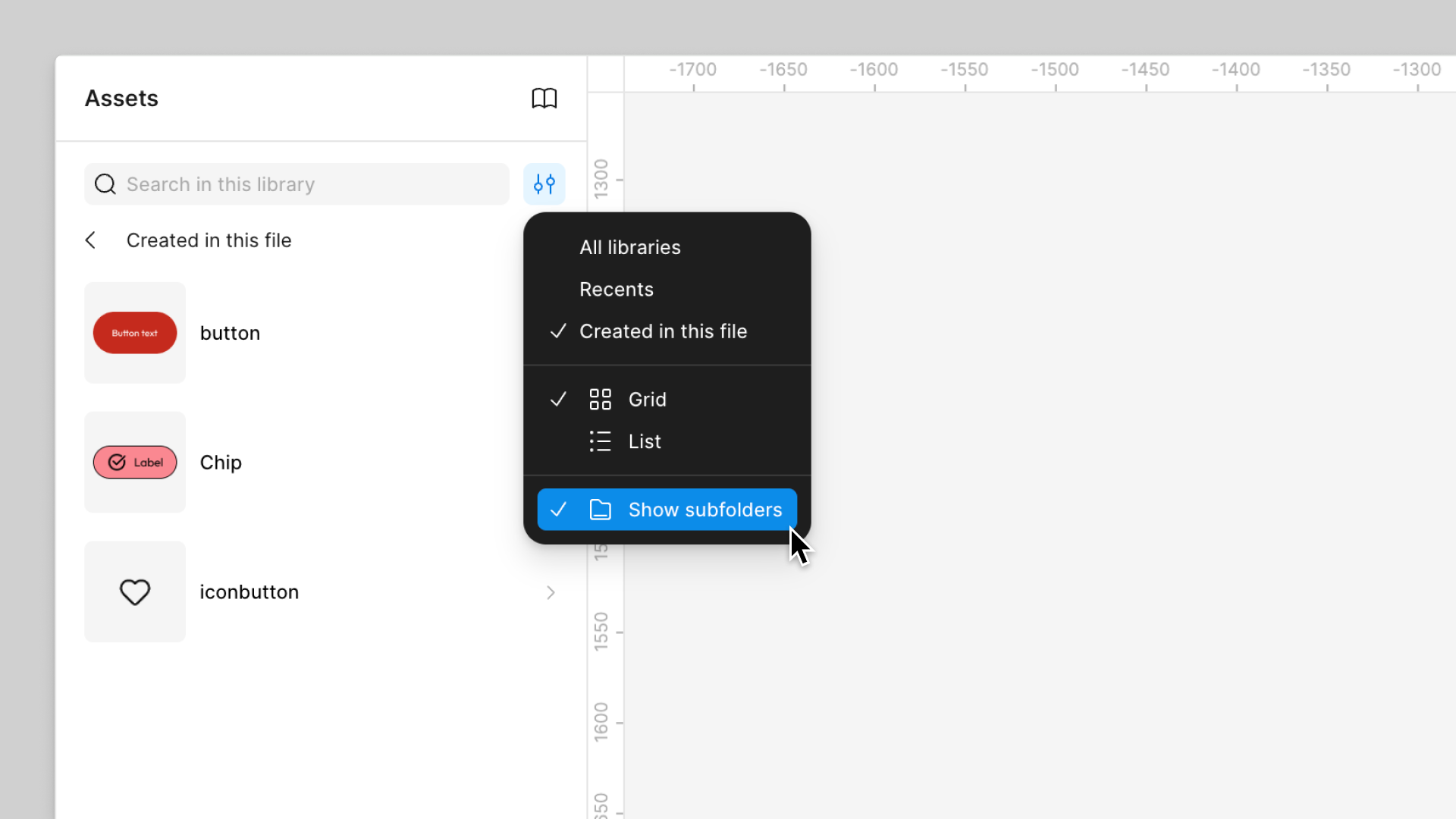 Note: When you have slash-separated component names, you can enable the Show subfolders setting to display components in a nested folder structure that mirrors your naming hierarchy. This is a helpful way to navigate large design libraries.
