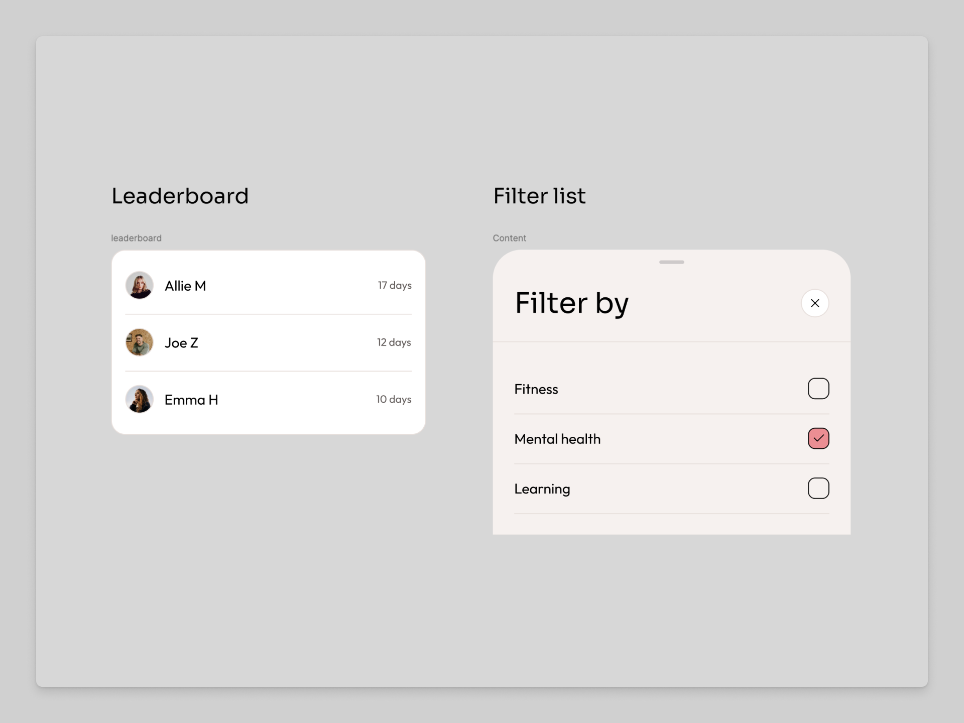 Next, we’ll create some trailing items for the list item: a checkbox component and a metadata component. These components will be placed on the right side of the list item component, and can be swapped out when using across different screens. For example, you can use the metadata component in a leaderboard to showcase user day streaks, or use the checkbox component in a filter menu.