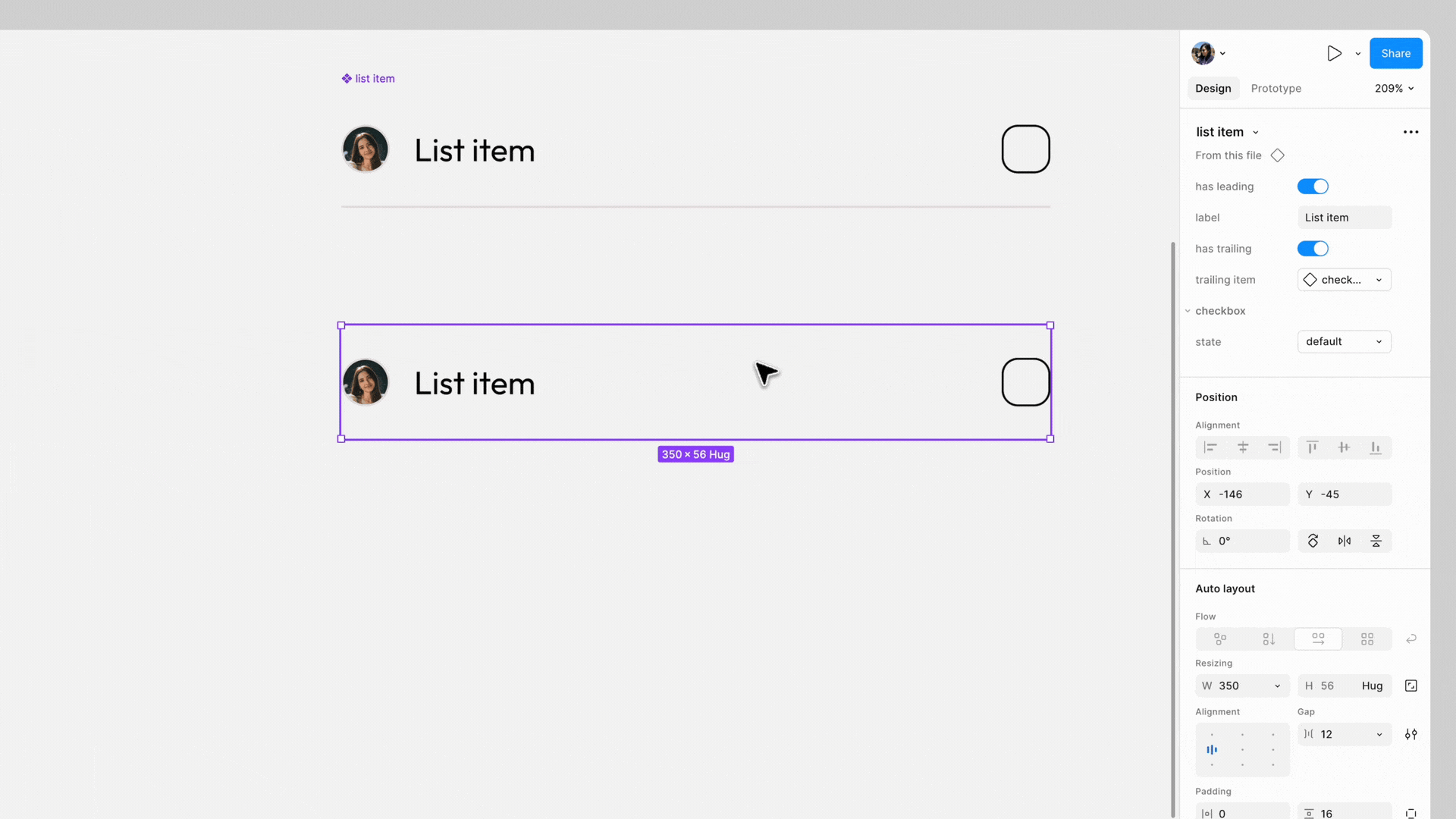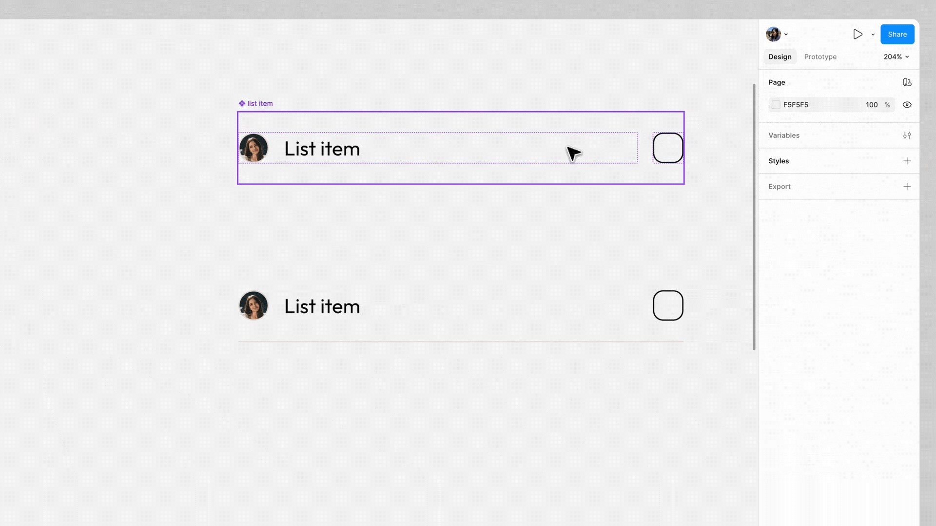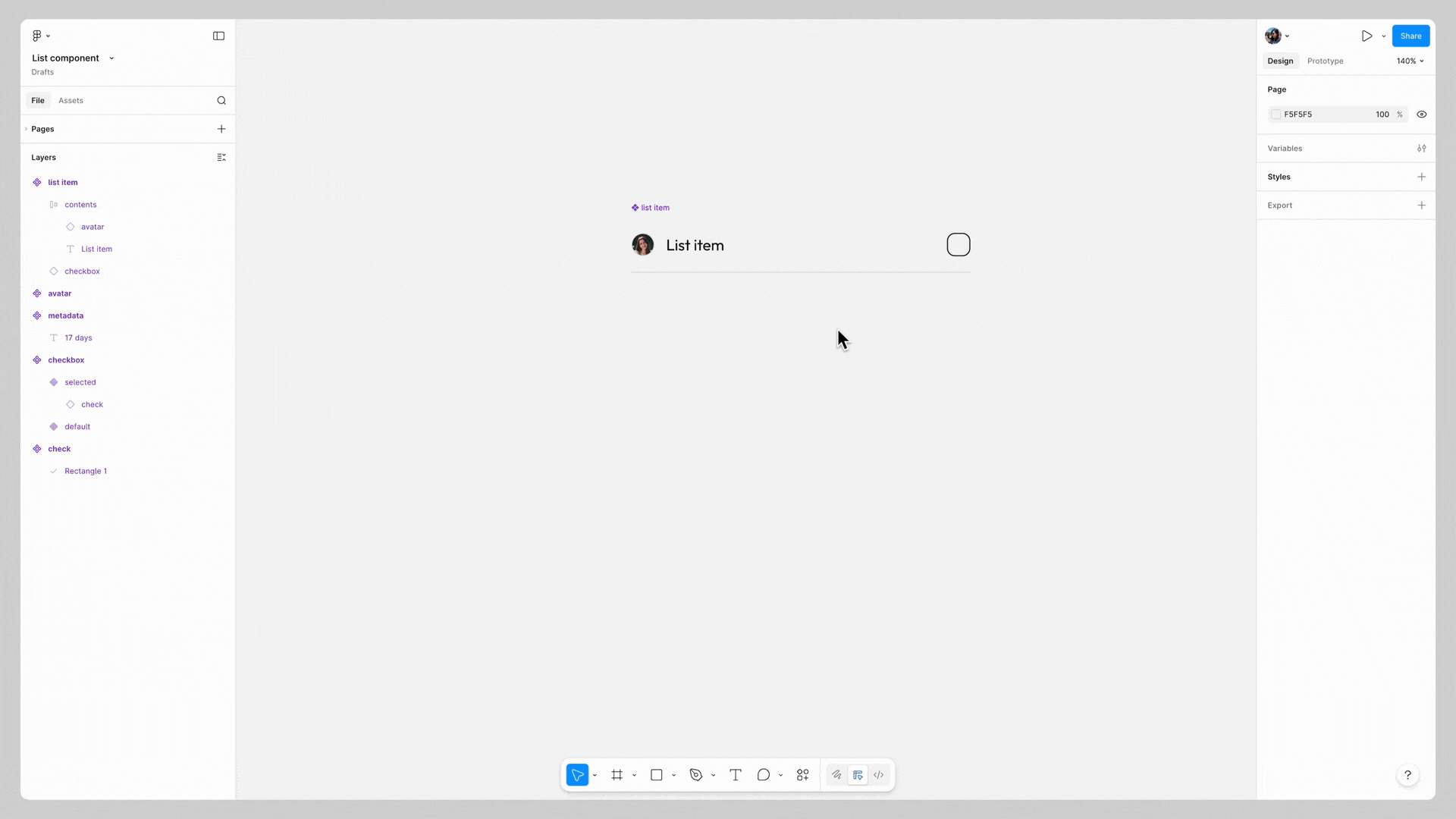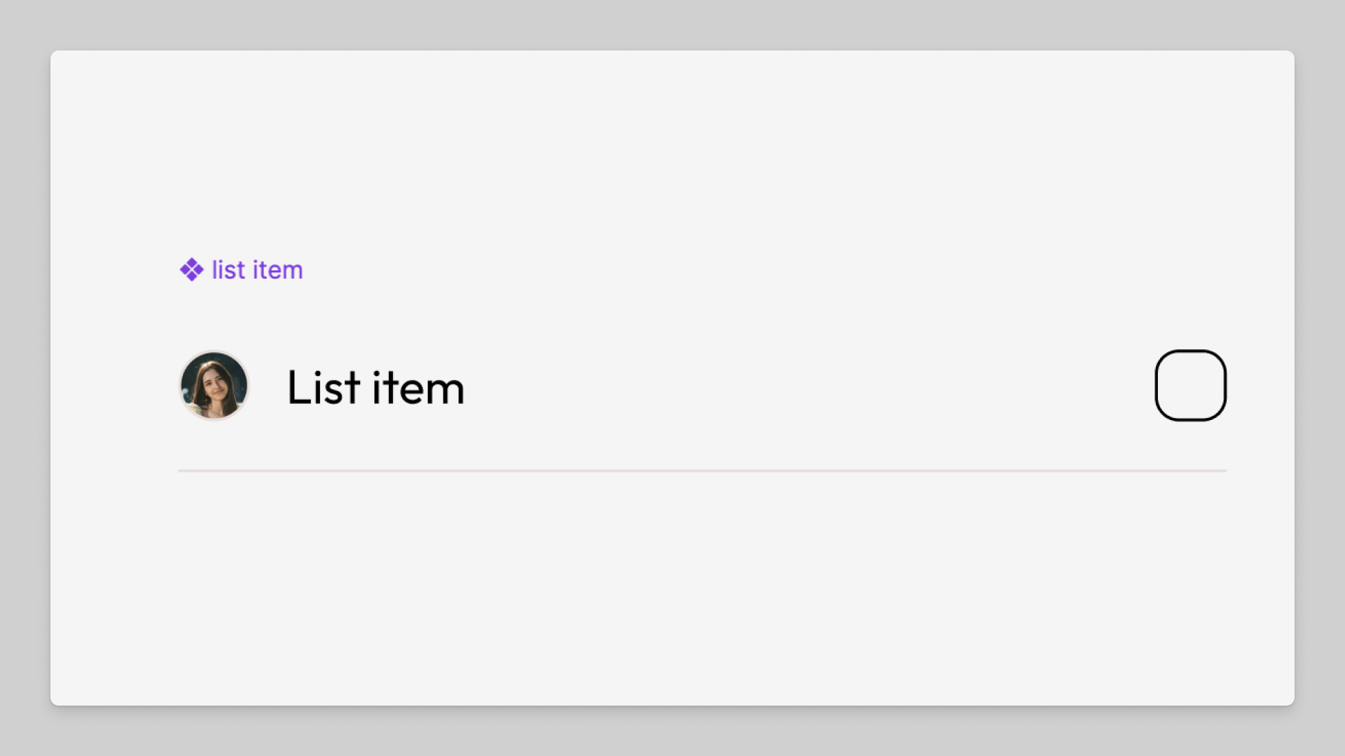 Great work! You just created a list component using auto layout, variants, component properties, and nested components! From here, you can keep refining it by adding more nested components like icons, switches, or radio buttons.