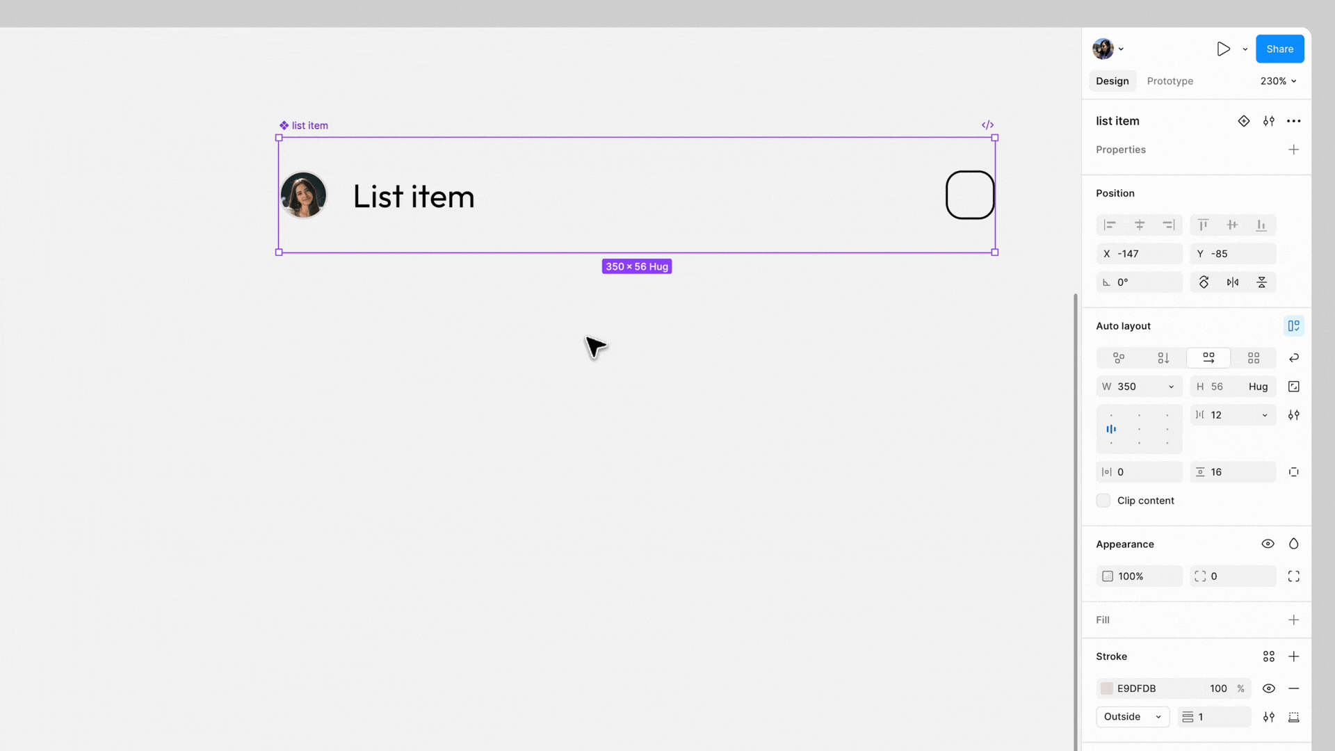 list item. - In the Auto layout section of the right sidebar, change the Width of the frame to