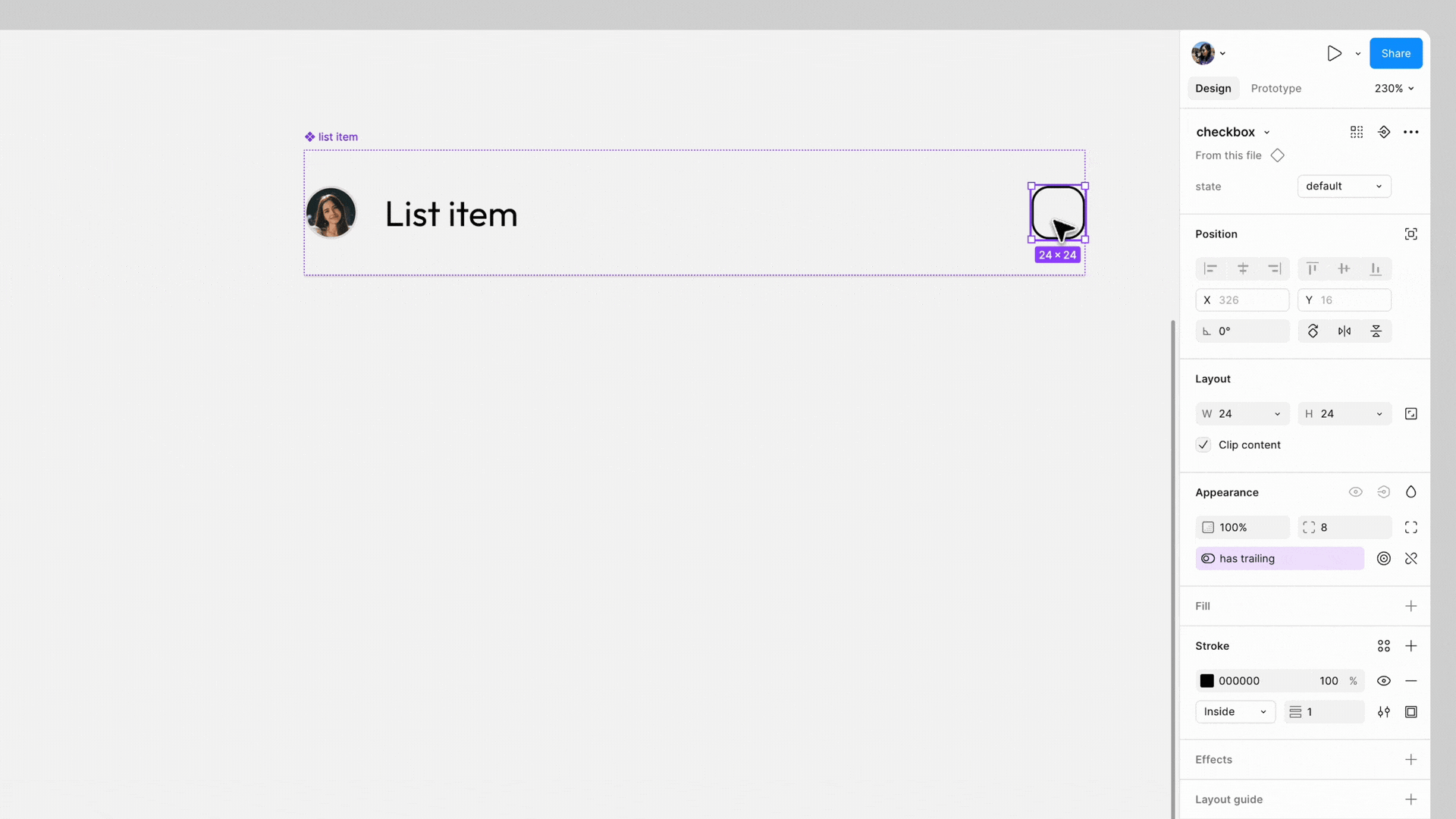 checkboxlayer inside thelist itemcomponent. - Near the top of the right sidebar, click Create instance swap property.