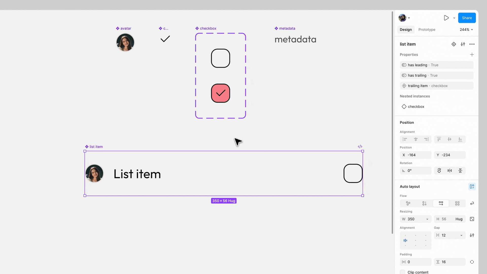 To wrap things up here, we’ll expose the nested checkbox instance to reveal its properties alongside the list item component.