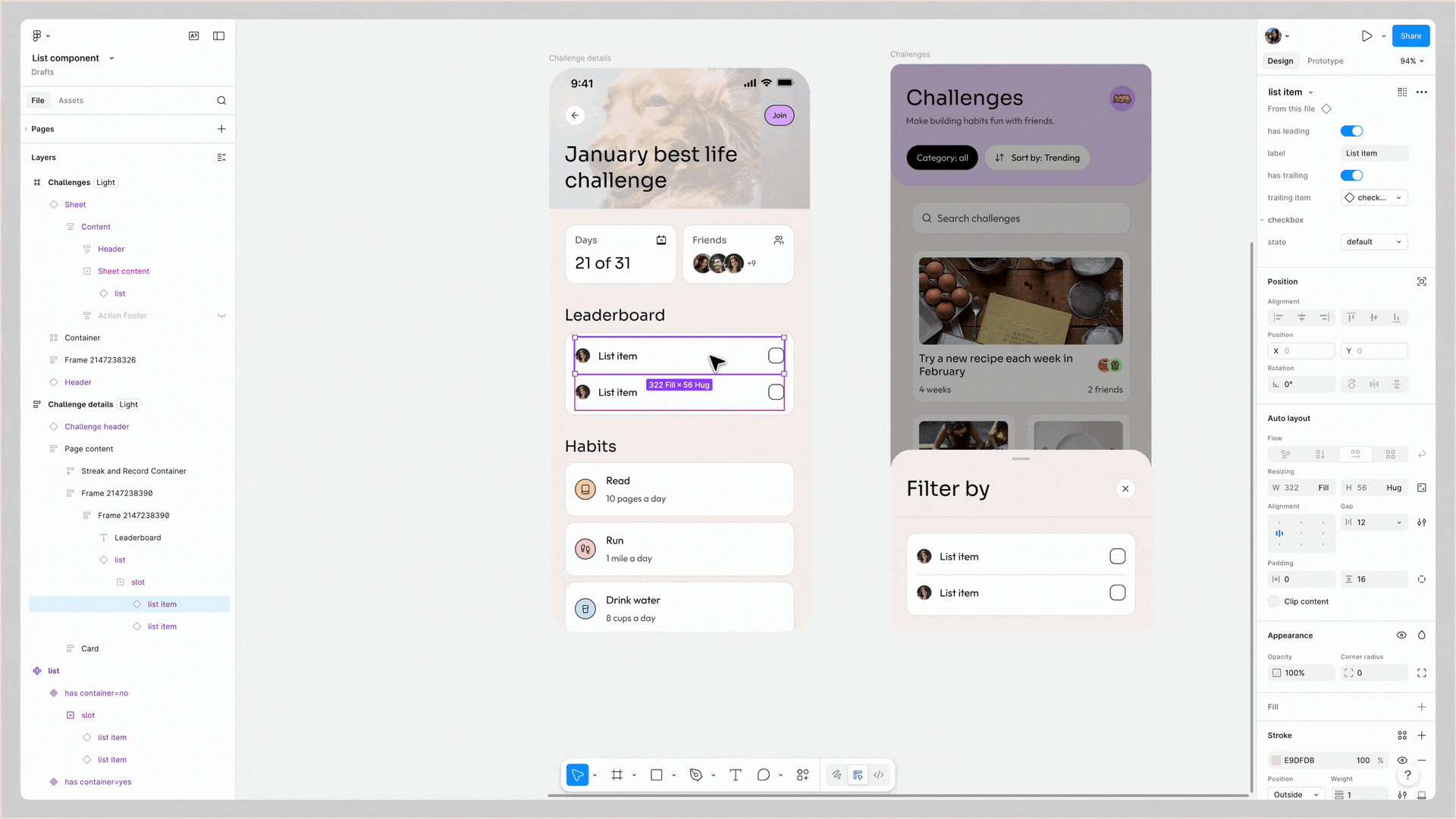 We’ll start by creating the avatar, metadata, and checkbox components, which we’ll nest inside the list item component. Then, we’ll create a list component that can group multiple list items together with two variants: one with a container and one without. This flexible design will enable users to use the component in many different contexts, such as a leaderboard or a filter list.