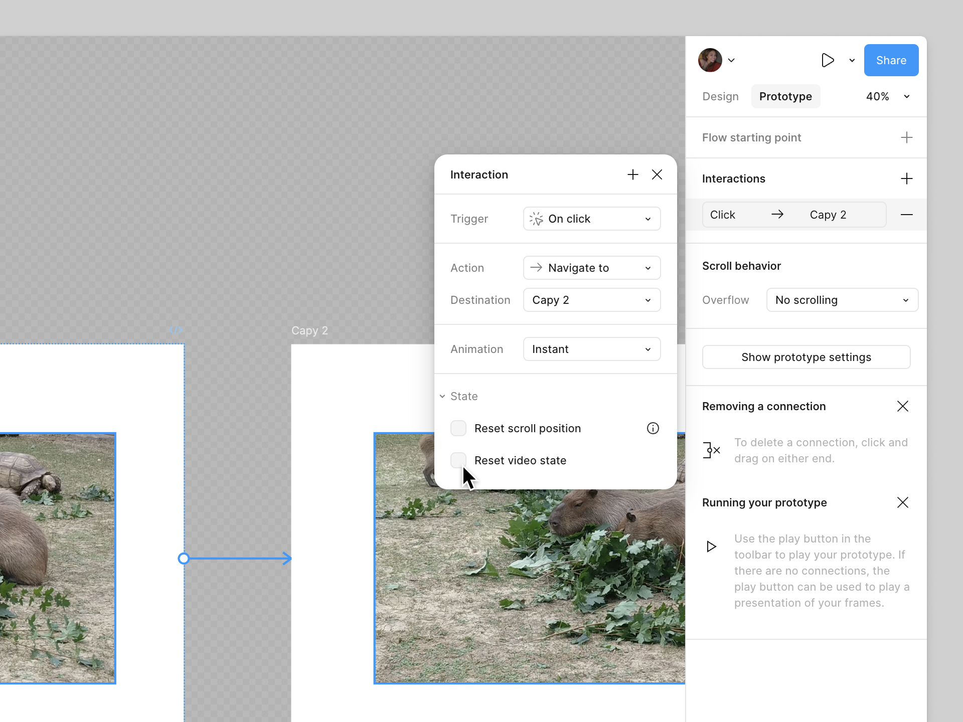 When you create an interaction between two frames that have the same video, there is a Reset video state toggle in the Interaction details panel. When toggled on, the video will restart from its beginning between frames. Learn more about video state management →
