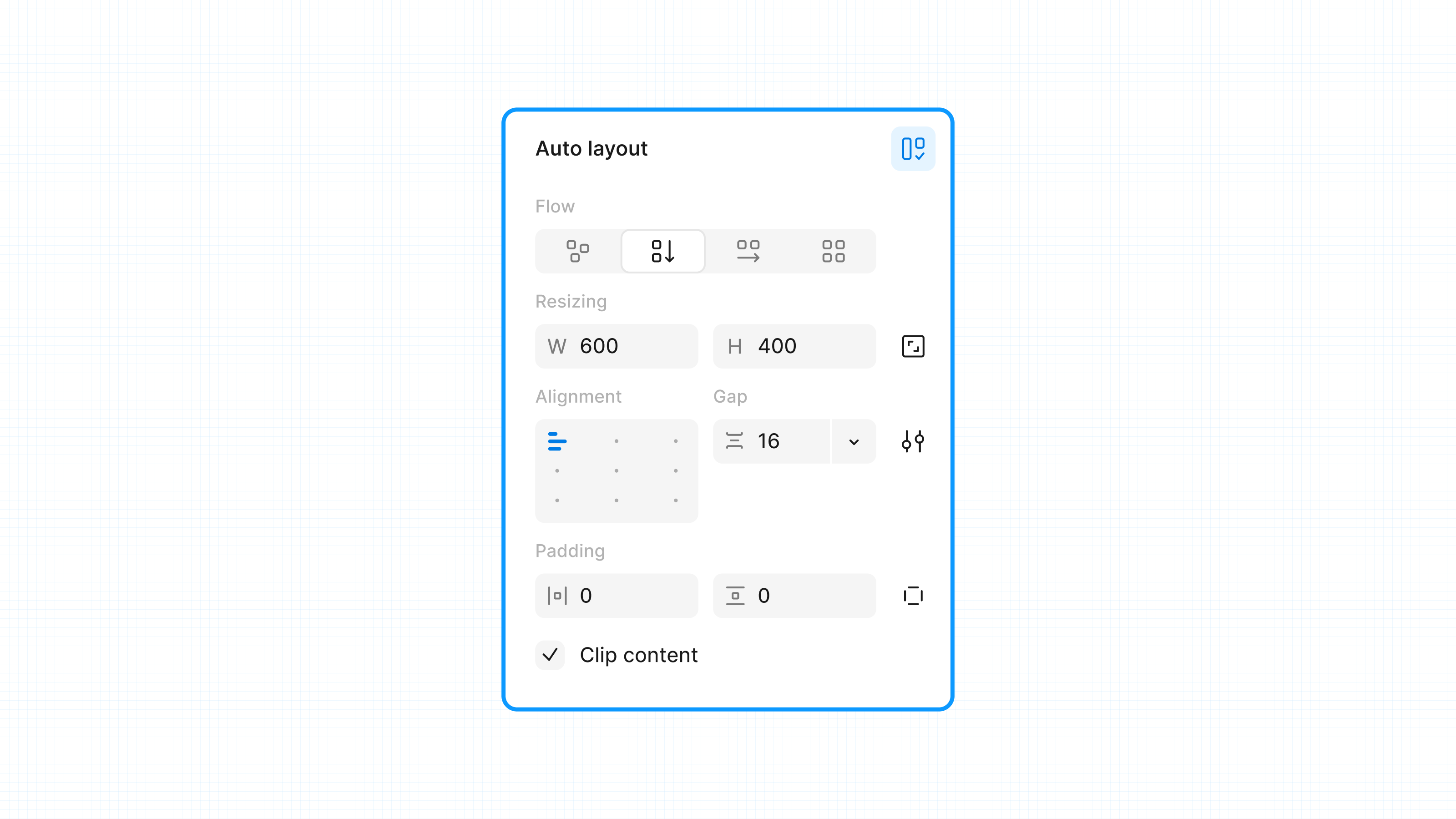 A diferencia de los grupos, los marcos pueden tener dimensiones y propiedades propias, como rellenos, esquinas redondeadas y sombras. También tienen características como disposición automática, restricciones y cuadrículas de disposición, que te permiten controlar o influir en las capas que contienen.