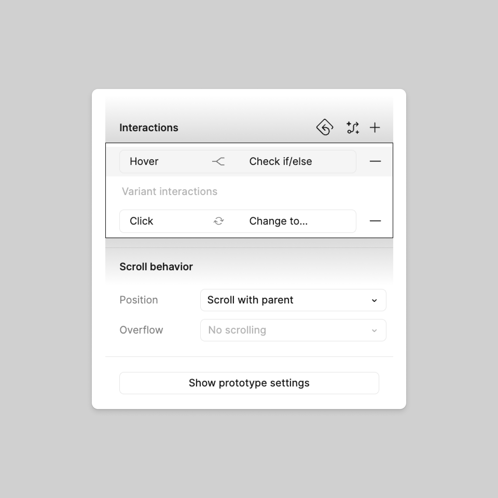 Cuando utilices componentes interactivos, verás secciones separadas para Interacciones e Interacciones de variante en la pestaña Prototipo de la barra lateral derecha.