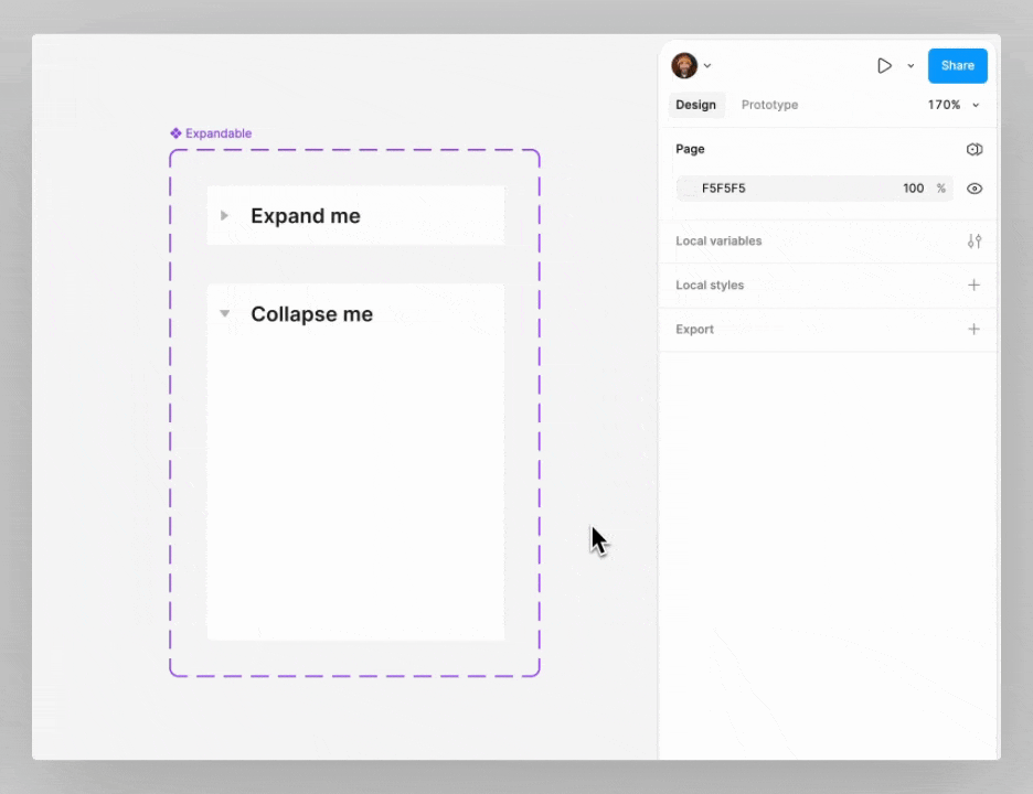 También puedes utilizar la acción Cambiar a en una instancia anidada para cambiar la variante del componente principal. En el siguiente ejemplo, una variante de un conjunto de componentes está anidada dentro de otro conjunto de componentes Expandible. Se coloca una interacción Cambiar a en la instancia anidada para cambiar el componente principal de su variante Contraída a su variante Expandida.