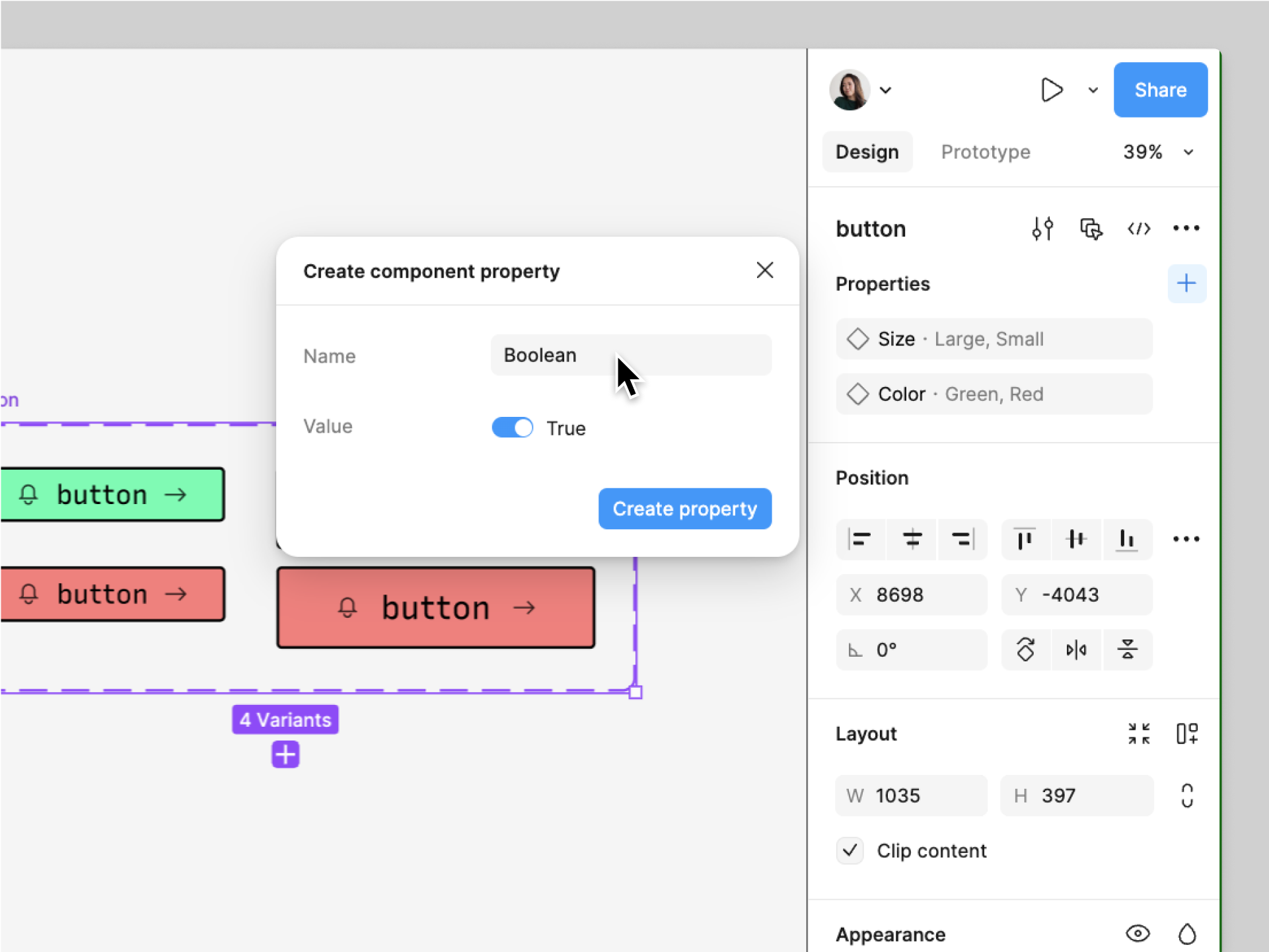Utiliza propiedades booleanas para establecer valores de verdadero o falso, lo que te permite activar o desactivar un atributo. Por ejemplo, si un sistema de diseño contiene botones con y sin icono, en lugar de crear variantes para cada estado, aplica una propiedad booleana a la visibilidad de la capa del icono.