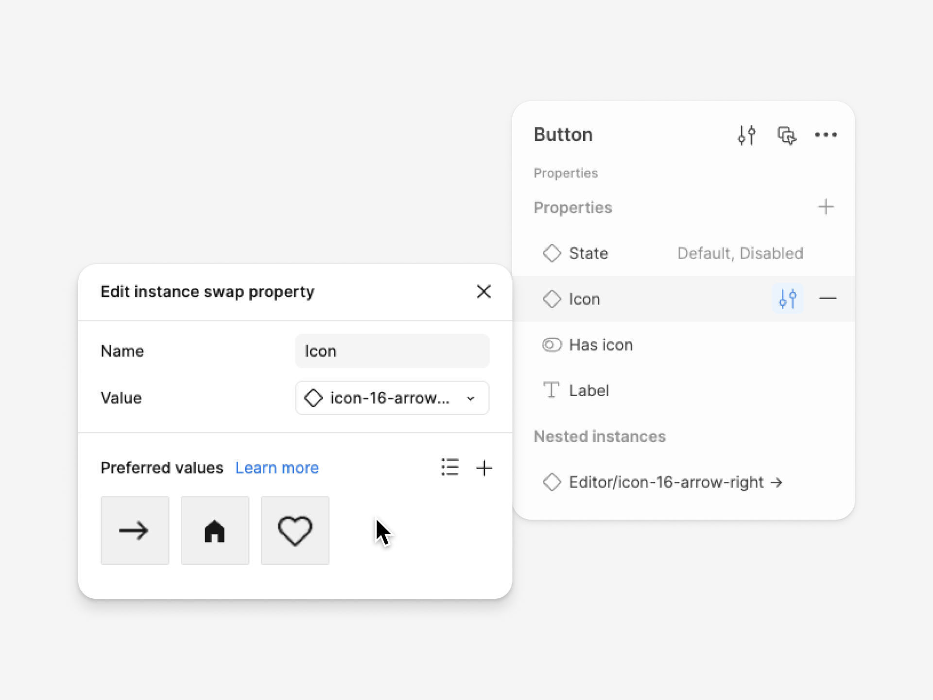 Los valores preferidos te permiten crear un conjunto seleccionado de componentes para elegir al intercambiar instancias (a través de la propiedad de intercambio de instancias). Reducen las conjeturas al comunicar qué componentes específicos pueden reemplazar a uno existente.