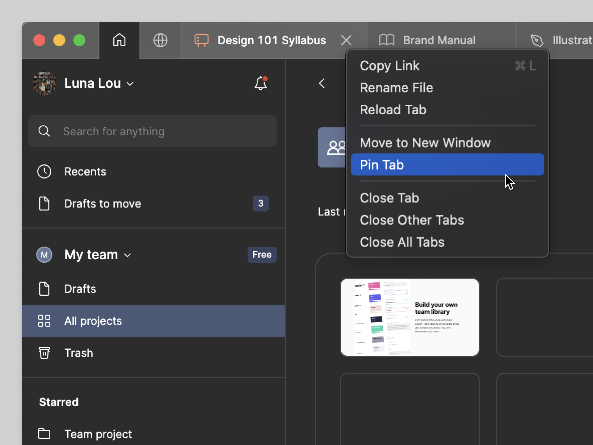 Para desanclar una pestaña, haz clic con el botón derecho en la pestaña y selecciona Unpin tab.