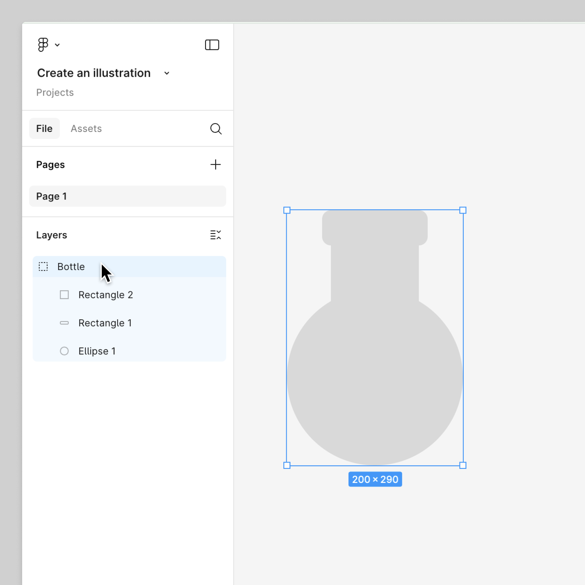 Vous remarquerez que le panneau des calques de la barre latérale gauche n'affiche plus qu'un seul calque nommé « Groupe 1 ». Nommer les calques est un autre moyen efficace de rester organisé dans Figma. Double-cliquez sur le calque et renommez-le « Bouteille ».