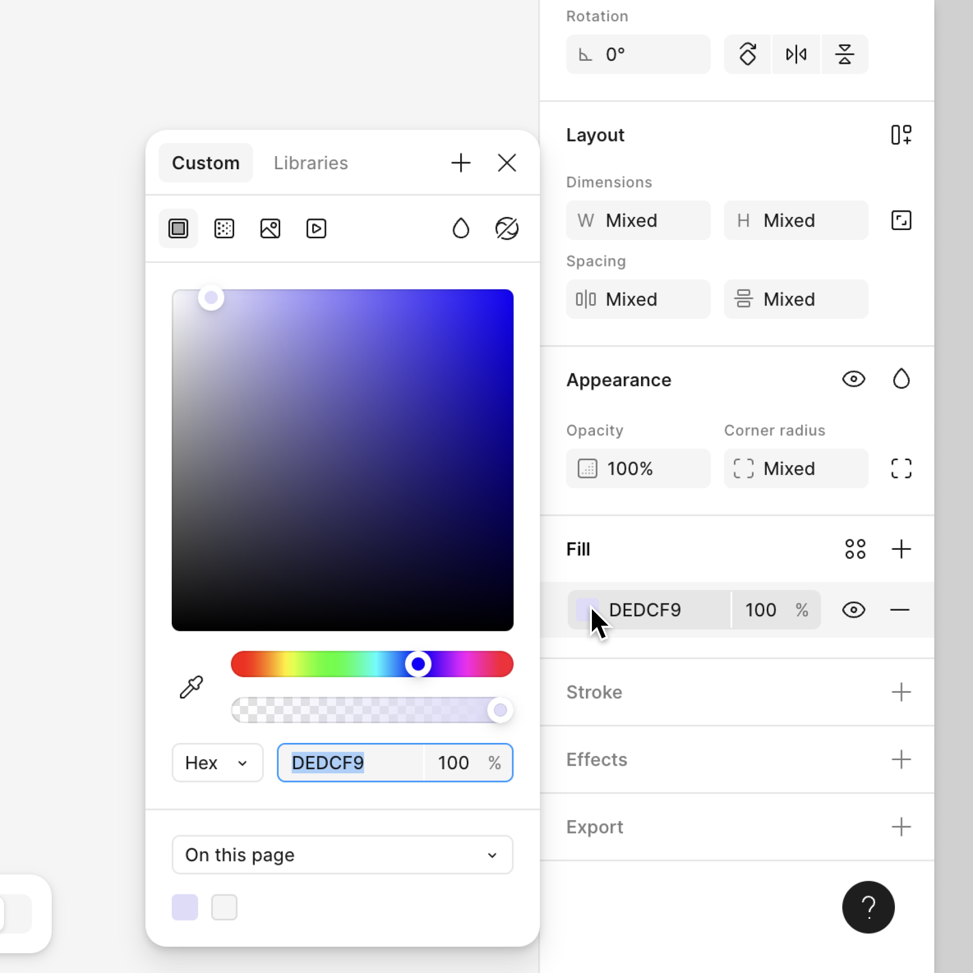 Donnons de la couleur à notre bouteille. Sélectionnez la bouteille et cliquez sur le paramètre Fill dans la barre latérale droite pour ouvrir le sélecteur de couleurs. Pour ce tutoriel, nous allons utiliser le code couleur #DEDCF9. Vous pouvez saisir le code dans le champ Fill ou utiliser le sélecteur de couleurs pour sélectionner une autre couleur.