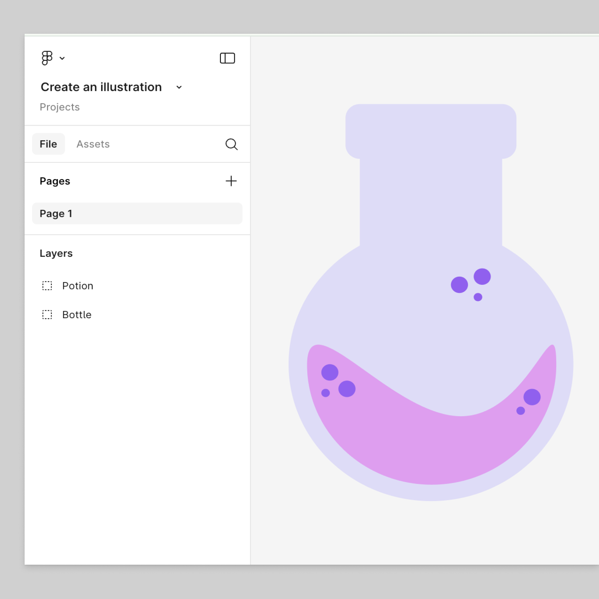 Dans le cadre de ce projet, nous allons illustrer une potion magique à l'aide du design Figma. La création d'illustrations est un moyen amusant de se familiariser avec l'éditeur et les outils Figma. Ne vous inquiétez pas si vous êtes novice en matière d'illustration ; nous utiliserons des formes, des groupes, des couleurs et des cadres de base. Nous verrons également comment l'organisation des calques peut avoir un impact sur vos designs.