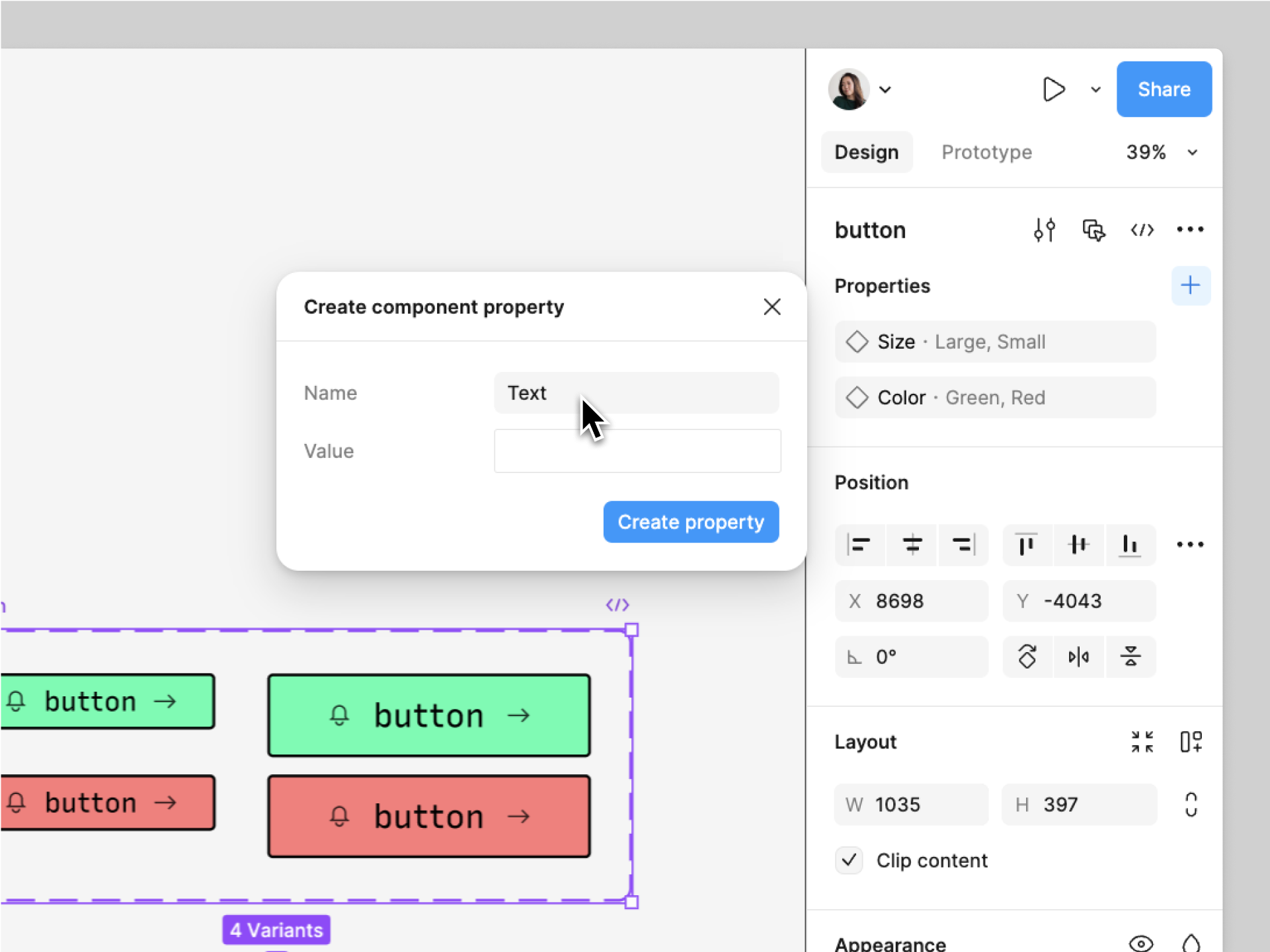 Les propriétés des composants sont liées à différentes propriétés de design. Vous pouvez créer des propriétés de composant pour n'importe quel composant principal ou n'importe quelle variante d'un ensemble de composants et les appliquer aux calques imbriqués du composant ou de la variante.