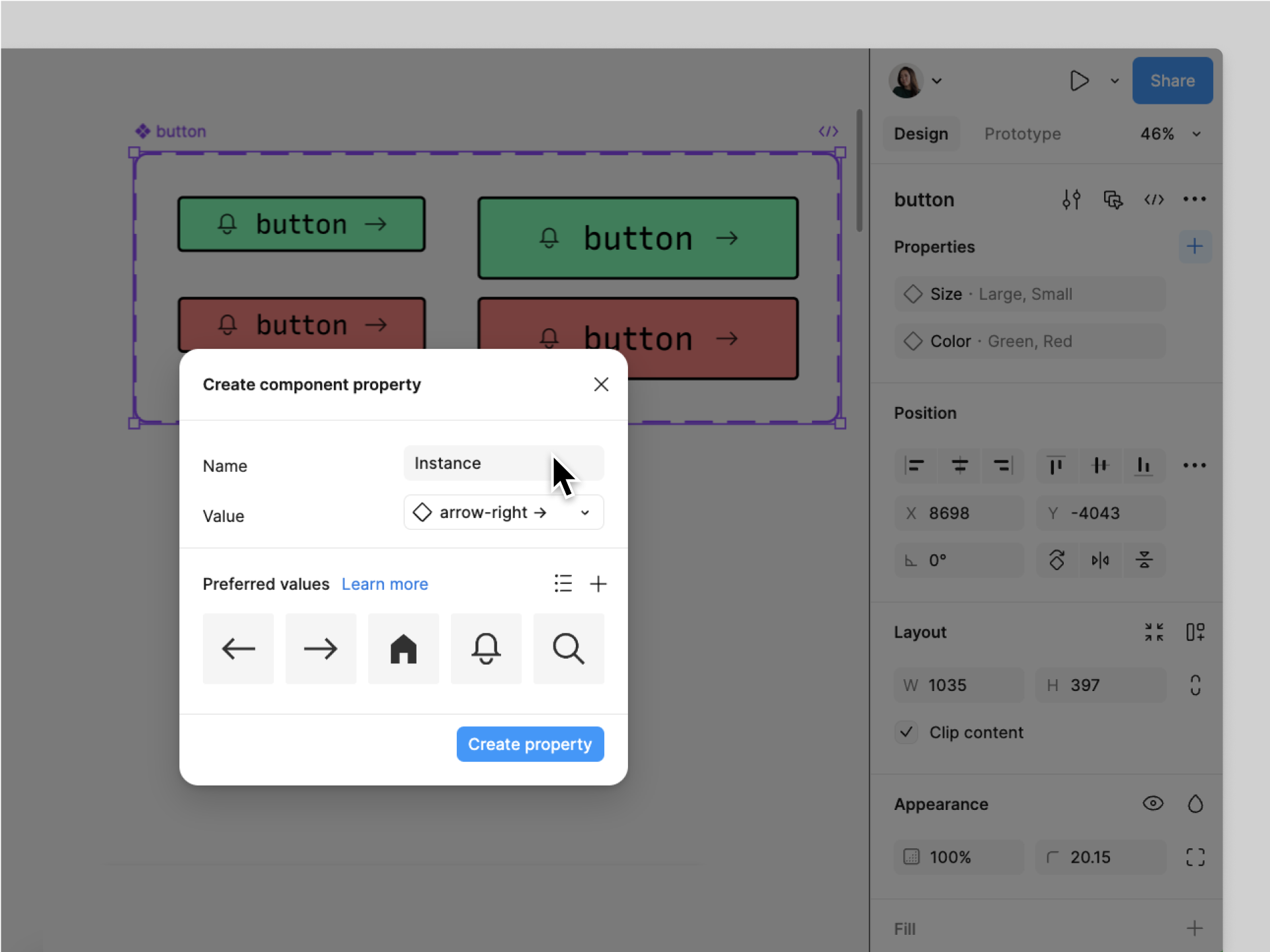 Conseil : Vous pouvez créer et appliquer une propriété booléenne à partir de n'importe quel calque imbriqué dans un composant principal ou une variante principale. Sélectionnez le calque imbriqué et recherchez la section Apparence, puis cliquez sur l'icône Appliquer la propriété . Une fois la propriété créée, elle est appliquée au calque sélectionné.