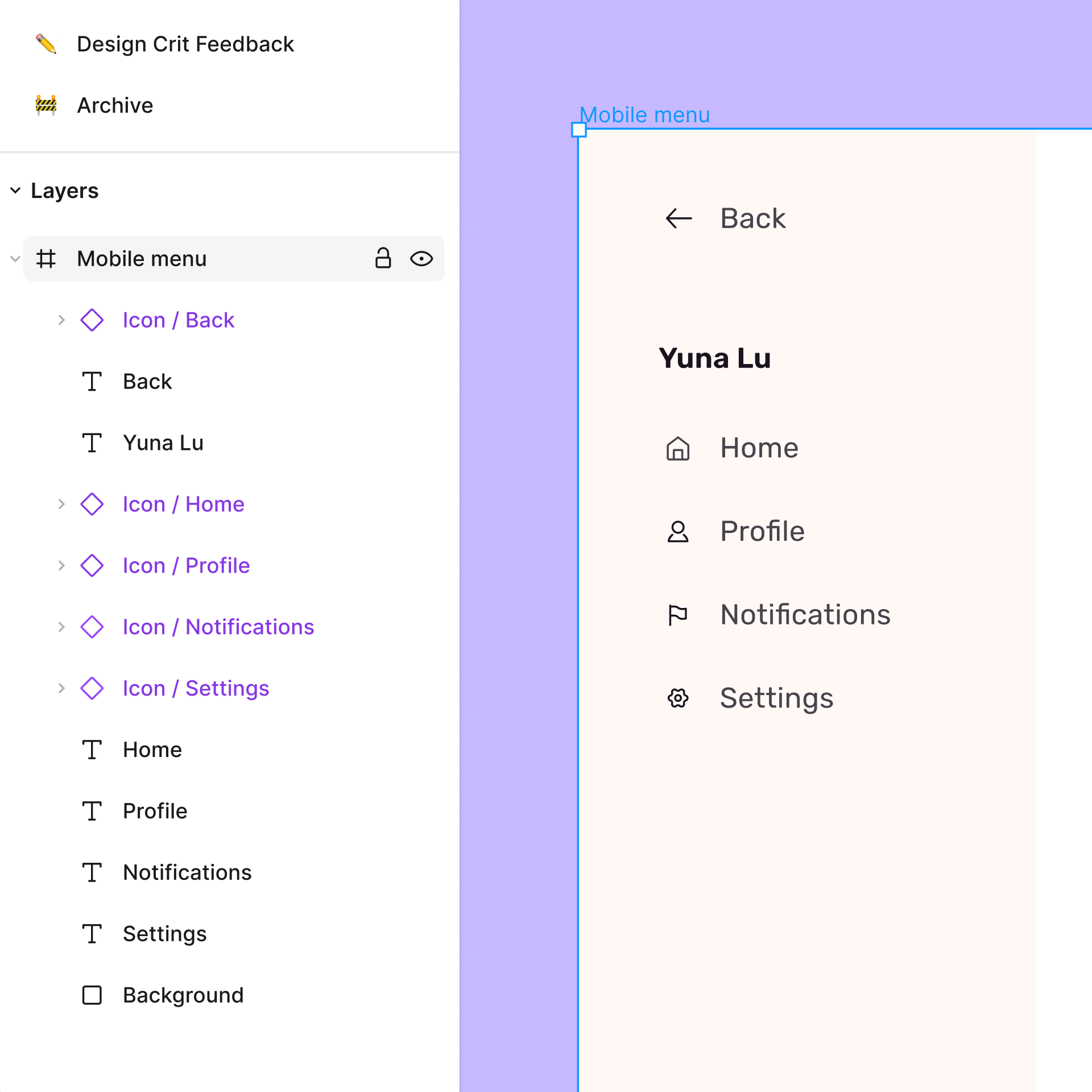 フレームは、Figmaの中でレイヤーを組み合わせるもう1つの方法です。アプリデザインの1つのページのように、フレームは特定のデバイスまたはスクリーンサイズの枠組みとして機能します。レイヤーのコンテナとしても機能し、ナビゲーションバーのレイヤーのように、個別の要素を構成します。他のフレームの中にフレームを置くこともできます。
