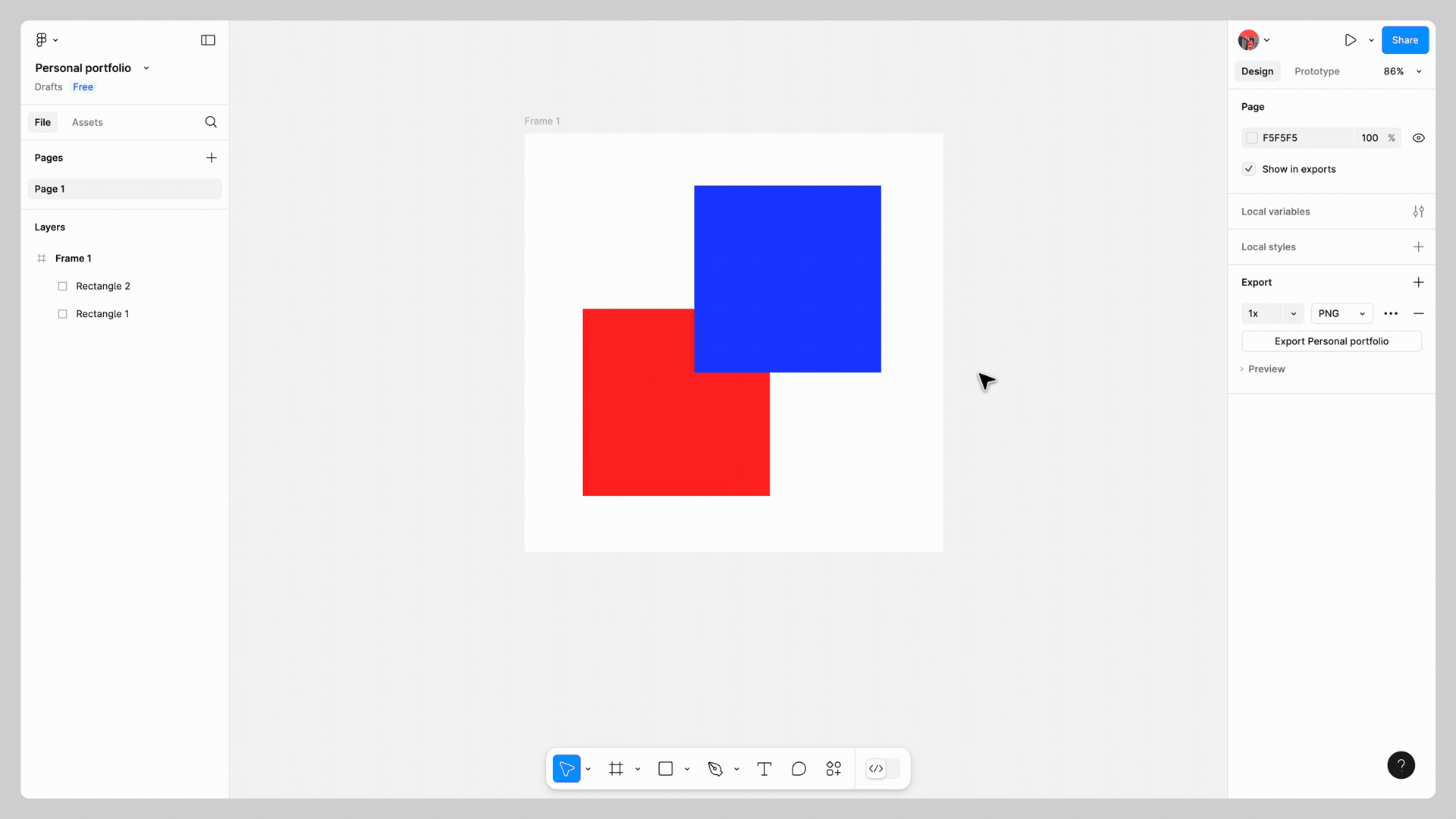 右のサイドバーには、デザインとプロトタイプの2つのタブがあります。[デザイン]タブでは、デザイン内のオブジェクトのプロパティの表示、追加、削除、変更が可能です。何も選択していない場合、キャンバスの背景色を変更したり、現在のページ上のすべてのコンテンツをエクスポートしたりできます。