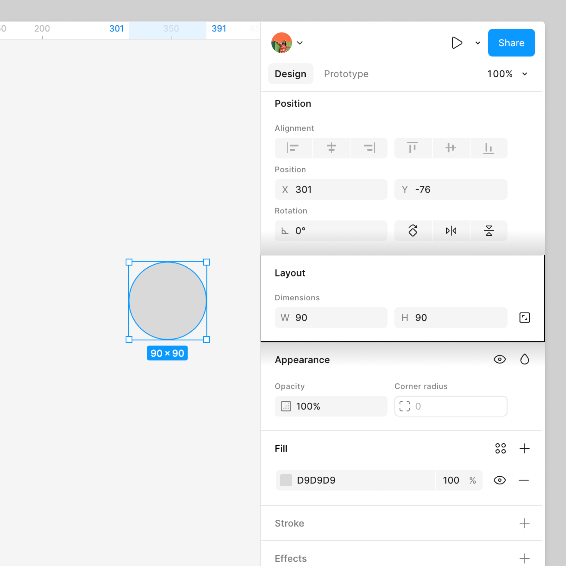 Figma Designには6つの形状ツールがあります:長方形、線、矢印、楕円、多角形、星。アバターを円形にしたいので、楕円ツールを使用します。