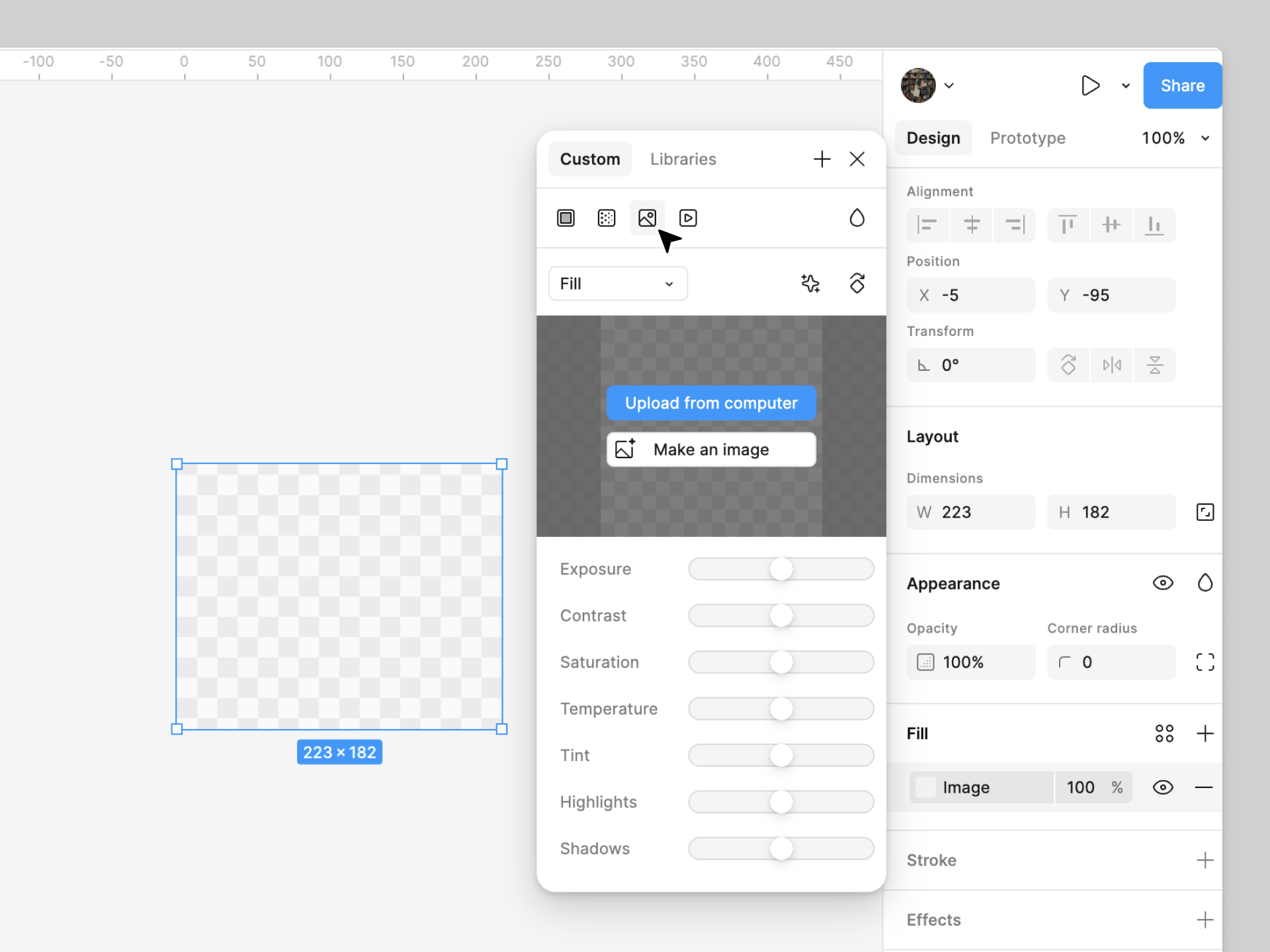 画像が楕円のデフォルトのグレーの塗りを置き換えます。画像設定を使用して、露出、コントラスト、温度などの属性を調整できます。