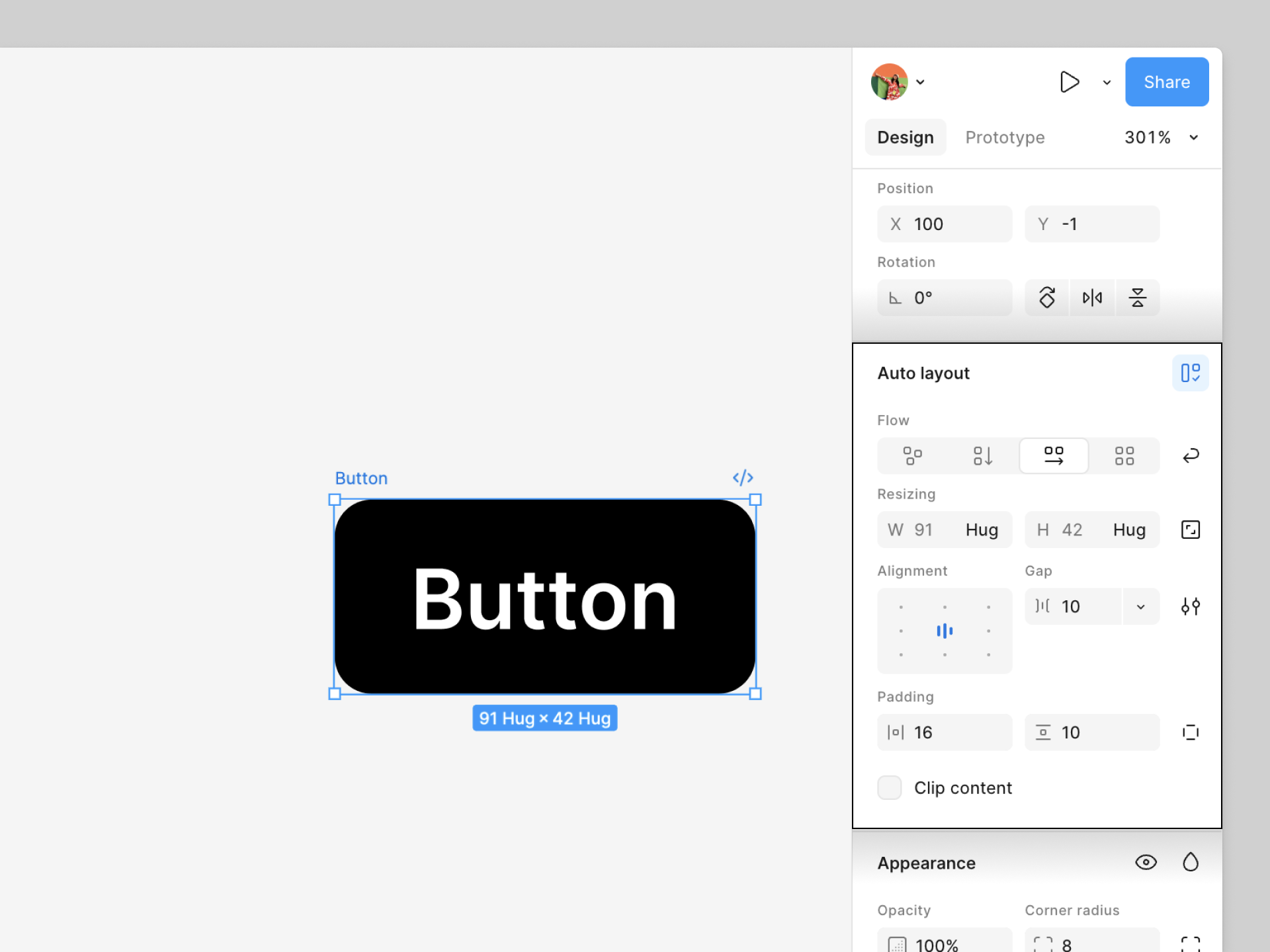 ボタンフレームを選択すると、右サイドバーのセクションがオートレイアウトに変更され、追加のプロパティが含まれていることに気付くかもしれません。寸法フィールドも変更され、現在はリサイズフィールドになっています。