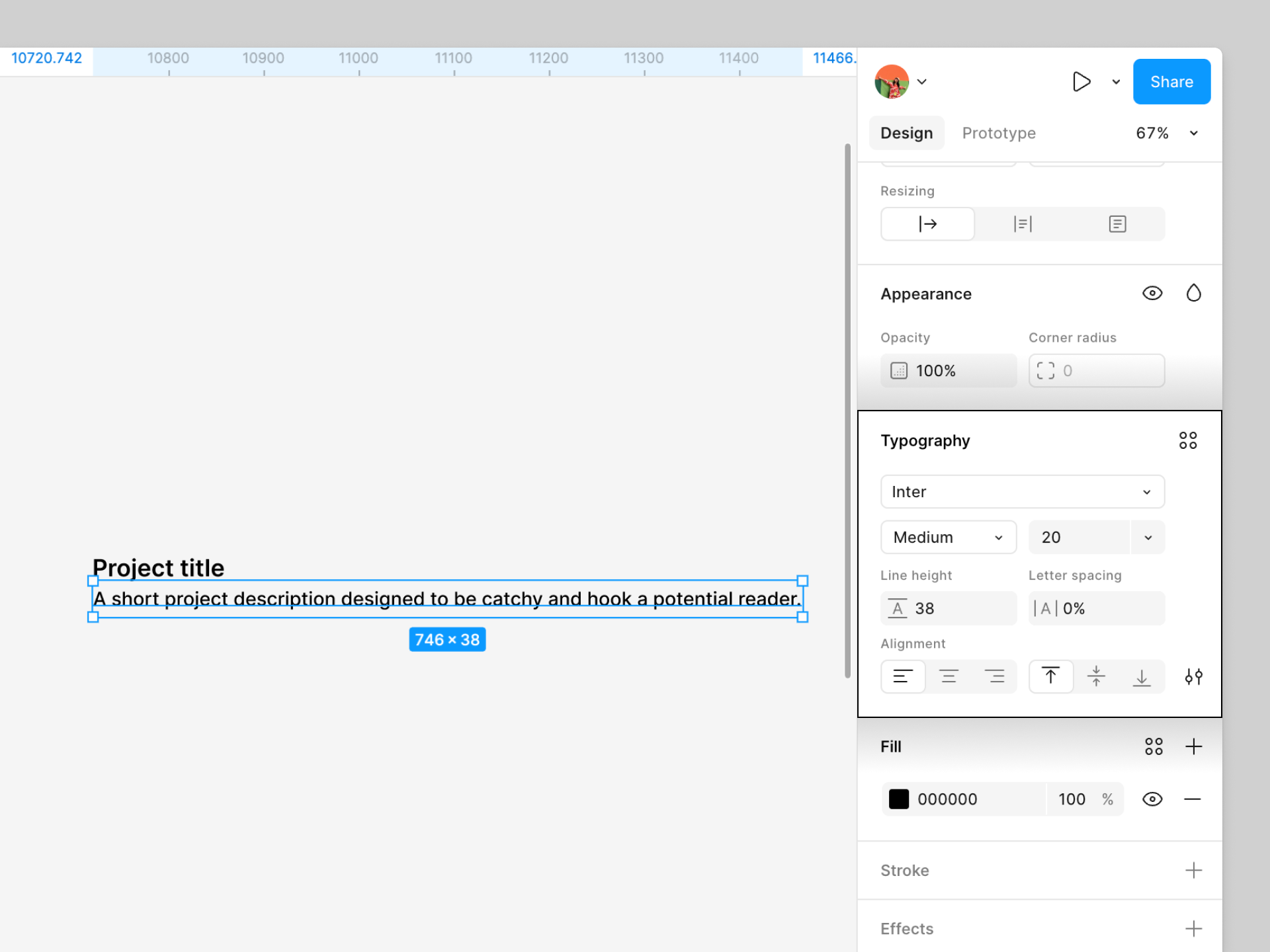 - 目を引くテキストフレームを選択し、Shift Aでオートレイアウトを追加します。