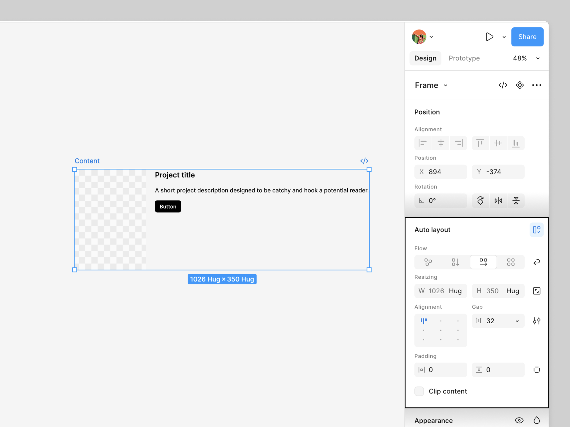 既存のレイヤーにオートレイアウトを追加する際、子レイヤーがキャンバス上に配置されている方法によってオートレイアウトのプロパティが決定されます。テキストとボタンレイヤーにオートレイアウトを適用した際、レイヤーが縦に積み重ねられていたため、Figmaはフレームの方向を縦に自動設定しました。サムネイルと説明レイヤーが並べて配置されているため、Figmaはコンテンツフレームの方向を水平に自動設定しました。