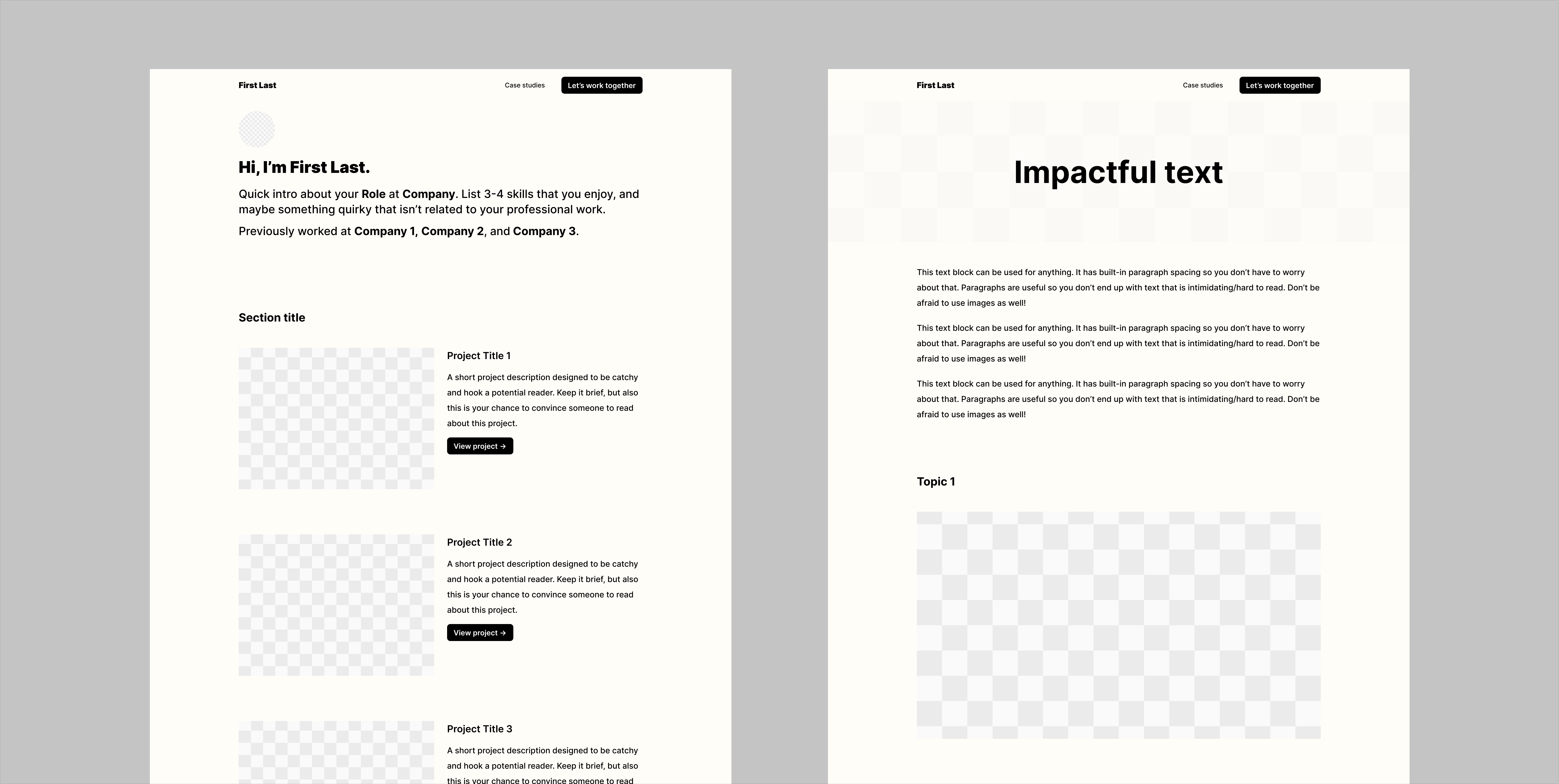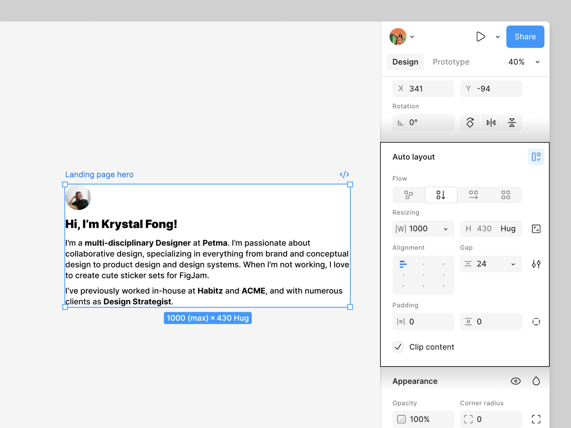 私たちの最終デザインのコンテンツフレームは、オートレイアウトが適用された他のフレーム内にネストされています。続けて見ていくと、ランディングページのヒーロー、テキストブロック、画像ブロックなど、多くの他のポートフォリオ要素にも同じことが言えます。なぜこのように構造化したのかを探ってみましょう。