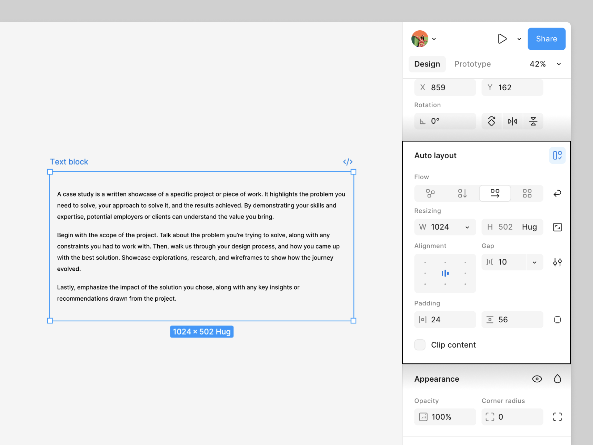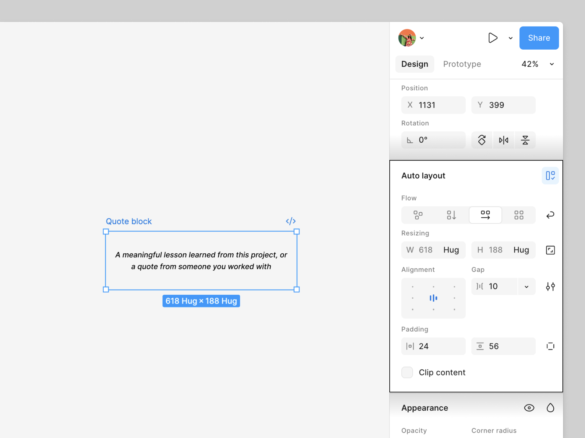 - 引用テキストレイヤーを選択し、Shift Aを使用してオートレイアウトを追加します。