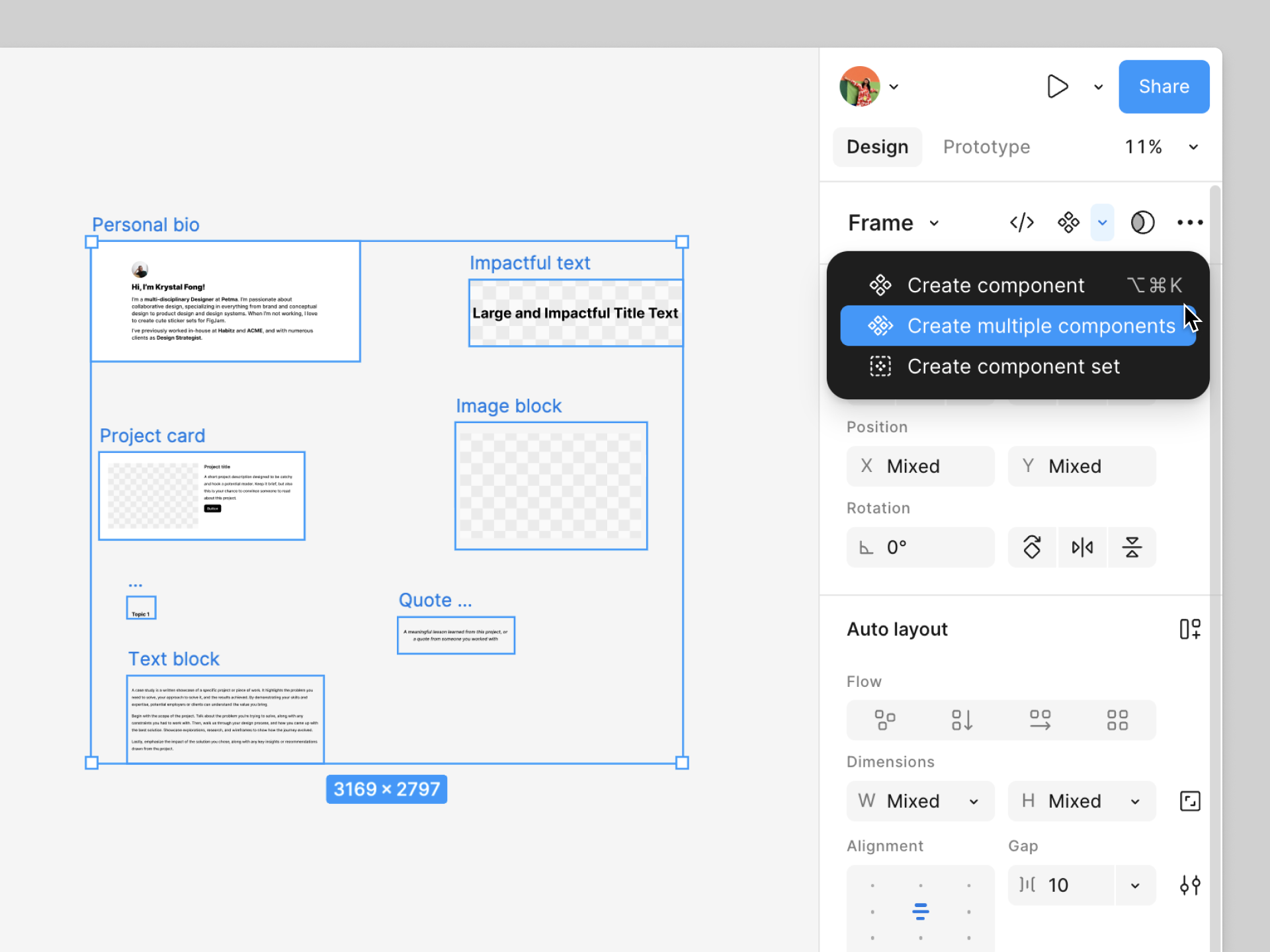 個々のコンポーネントを作成する代わりに、一括でコンポーネントを作成できます。一度に最大100個のコンポーネントを作成でき、今がその使い時です。
