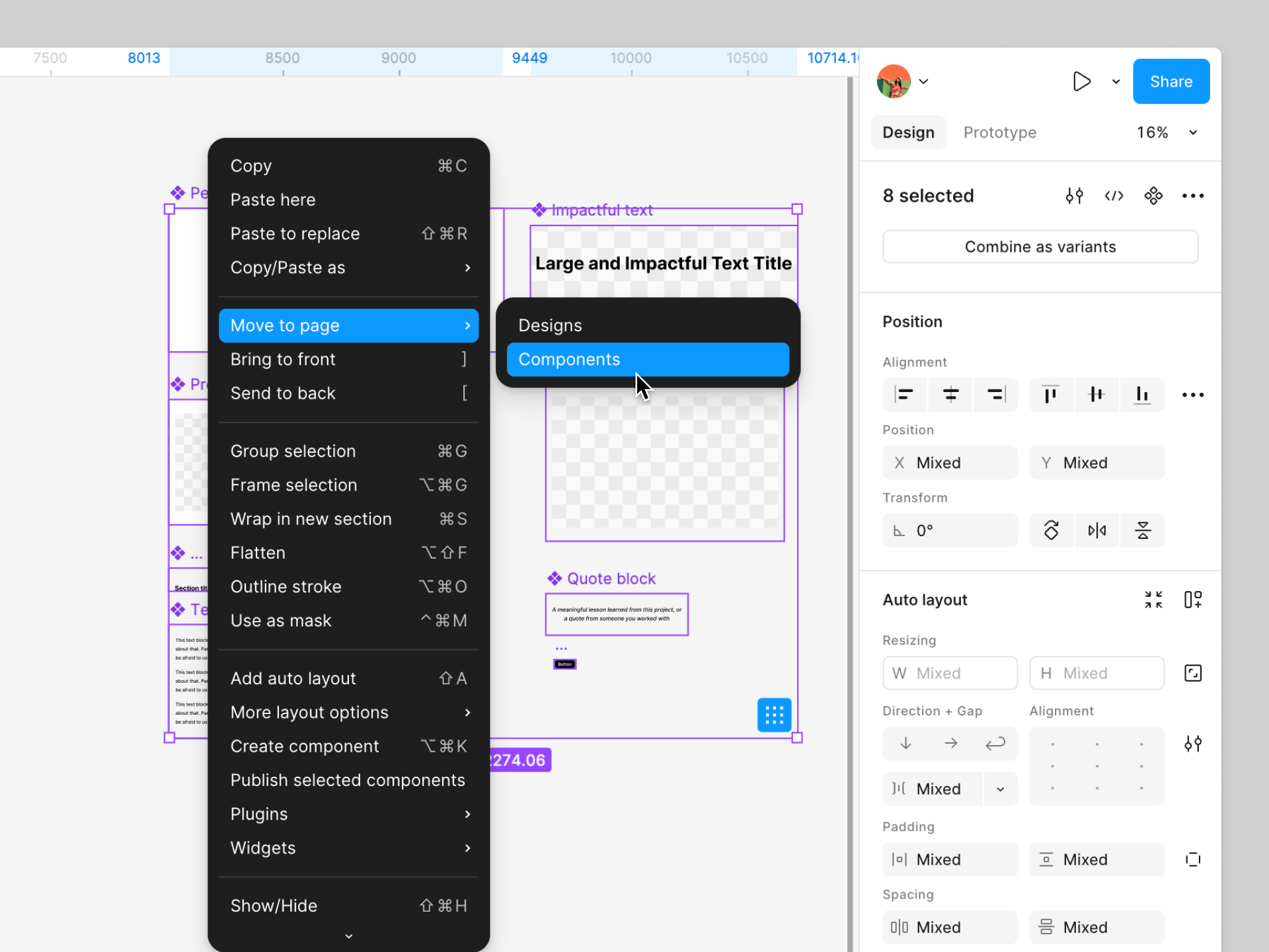 - 選択を右クリックし、ページに移動にカーソルを合わせ、コンポーネントを選択します。