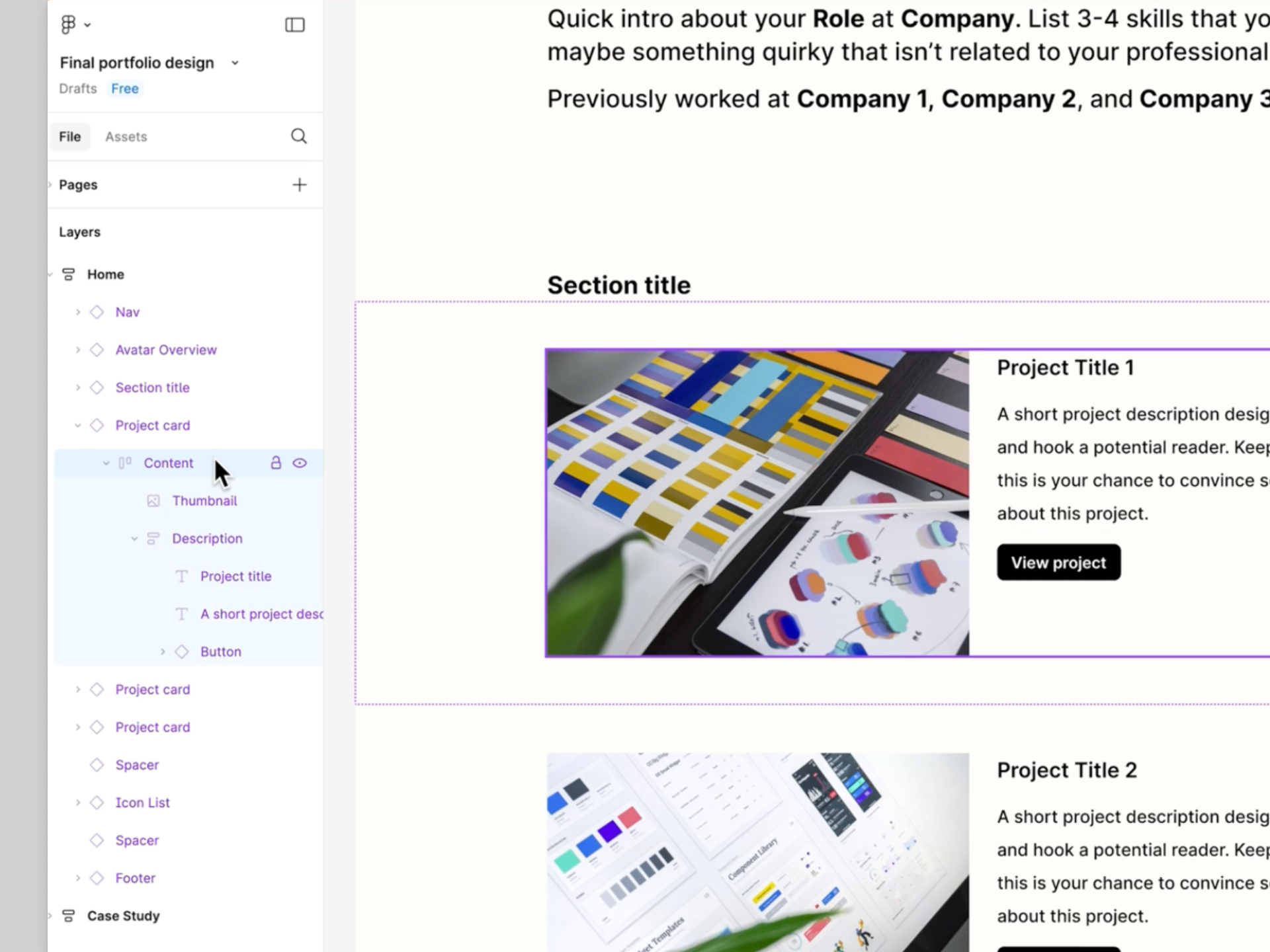 素晴らしい出来です!オートレイアウトを使用したカード要素のデザインに加え、他のポートフォリオ要素を見直してコンテナシステムに追加しました。レッスンを終了し、ポートフォリオ要素を再利用可能なコンポーネントに変更し、それらを専用のコンポーネントページに移動しました。