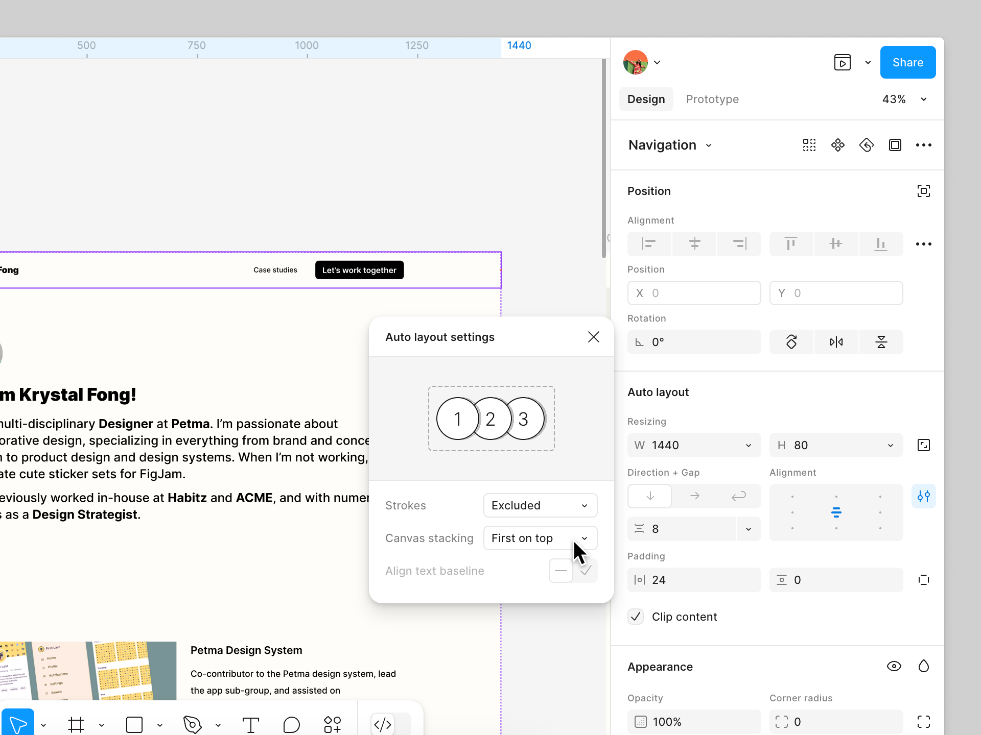 ページのコンテンツがナビゲーションバーの上をスクロールしてしまう場合は、キャンバススタッキングプロパティを調整する必要があります。キャンバススタッキングは、オートレイアウトフレームの最上層または最下層のレイヤーが視覚的に上に表示されるかどうかを決定します。